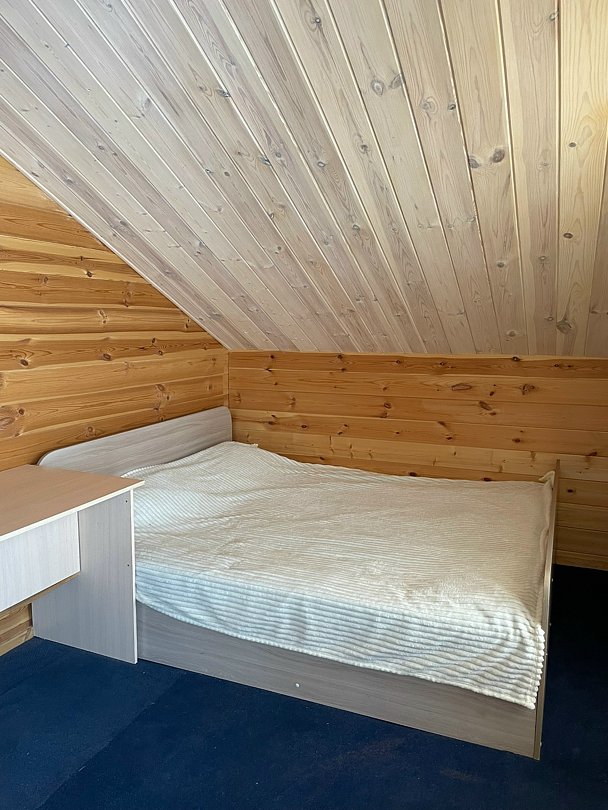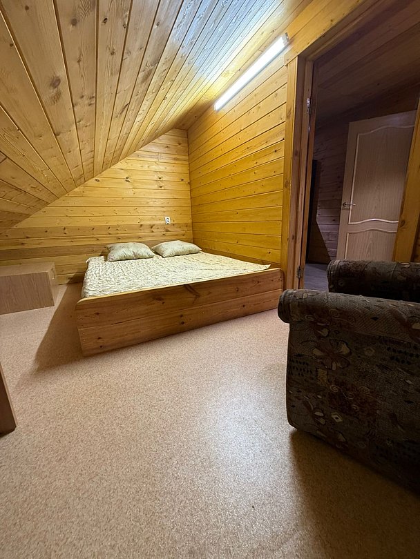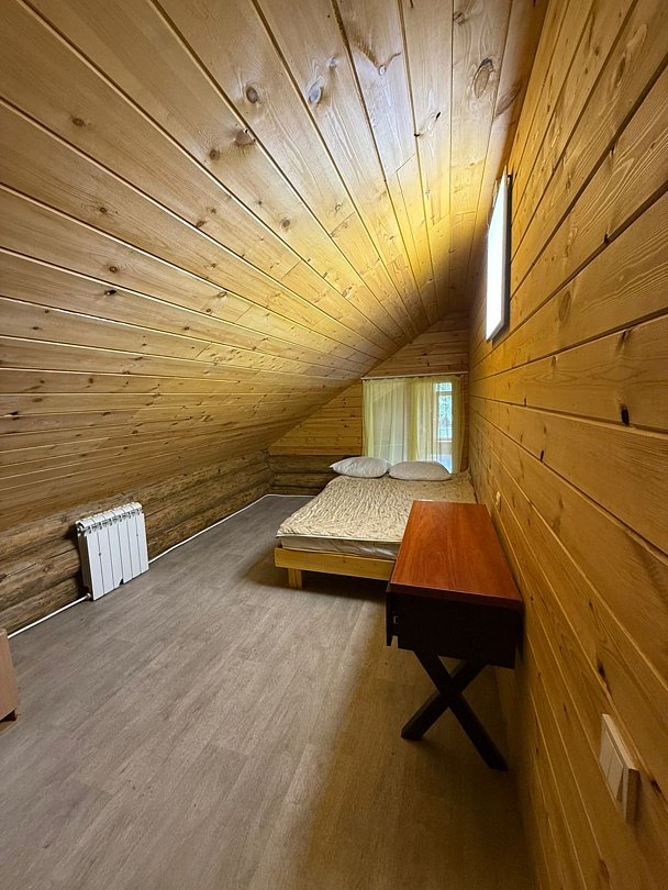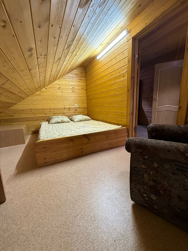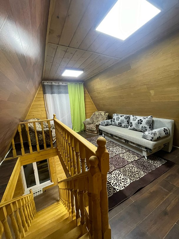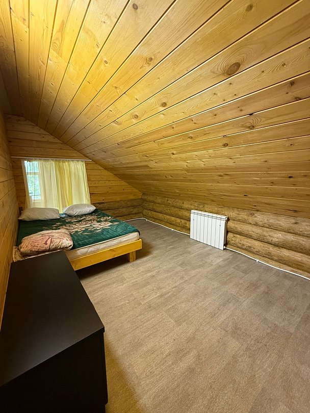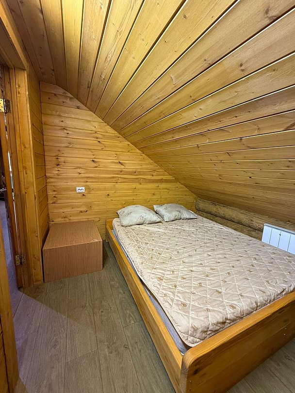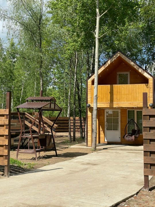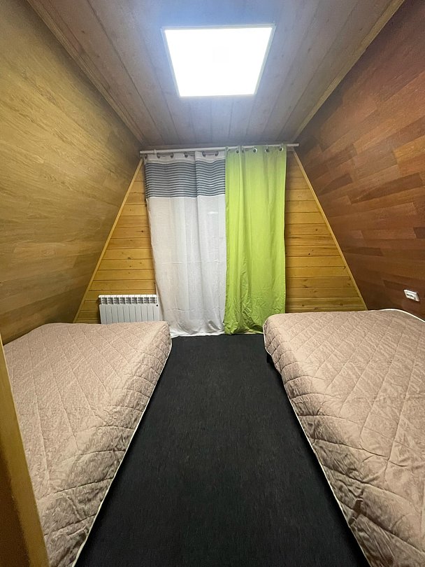На втором этаже 1 комната с 2-мя спальными местами и холл с диваном книжкой. Домики в лесу.