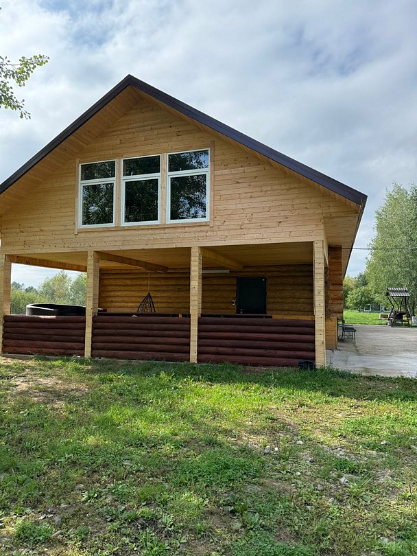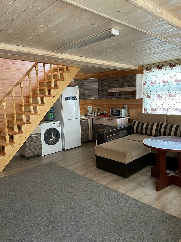 Дом с верандой. В доме 2 комнаты с 3-мя спальными местами на 2-ом этаже. На первом этаже большая гостиная, с зоной кухни. В доме есть минимальная необходимая посуда. Телевизор, холодильник, микроволновка, плитка.