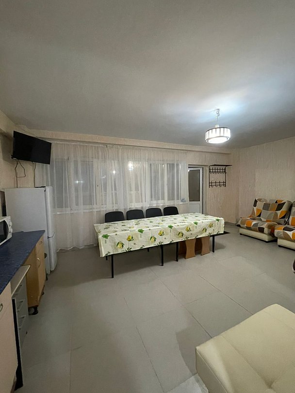 Две большие комнаты. В одной комнате две 2-х спальные кровати, кровать для малыша + диван книжка. Во второй комнате зона кухни. Софа одно спальное место и угловой диван.