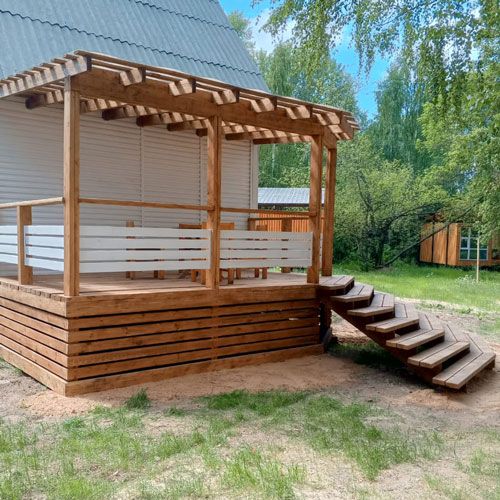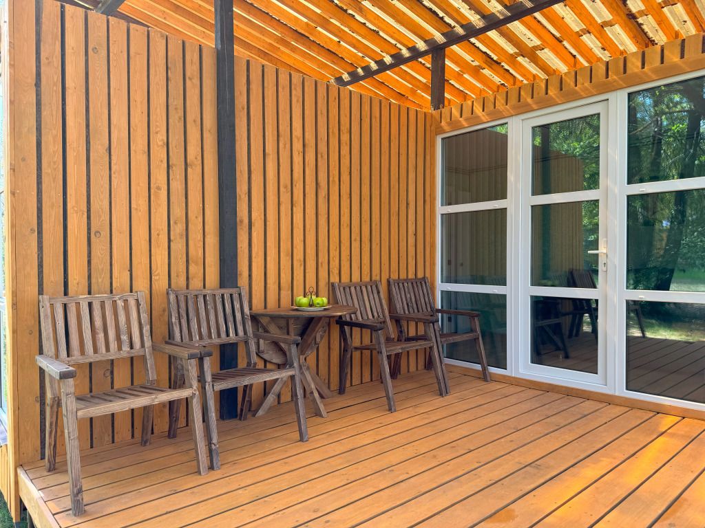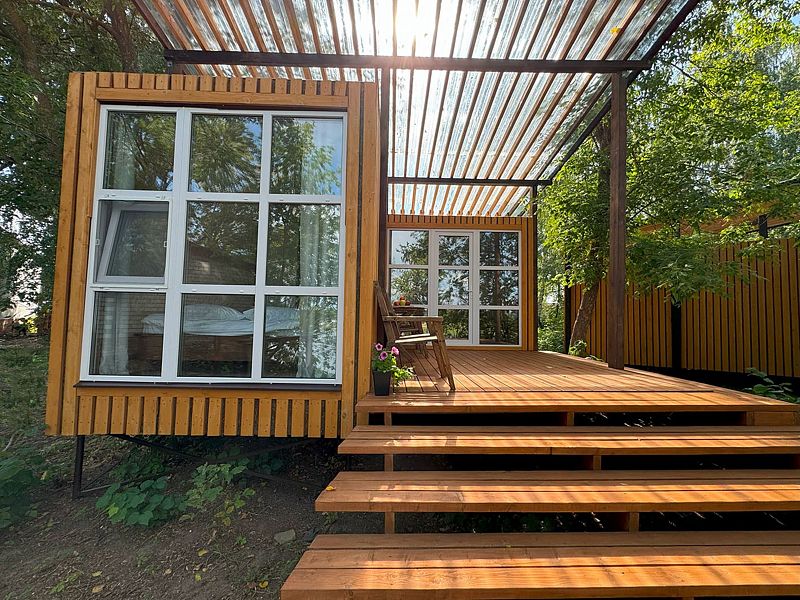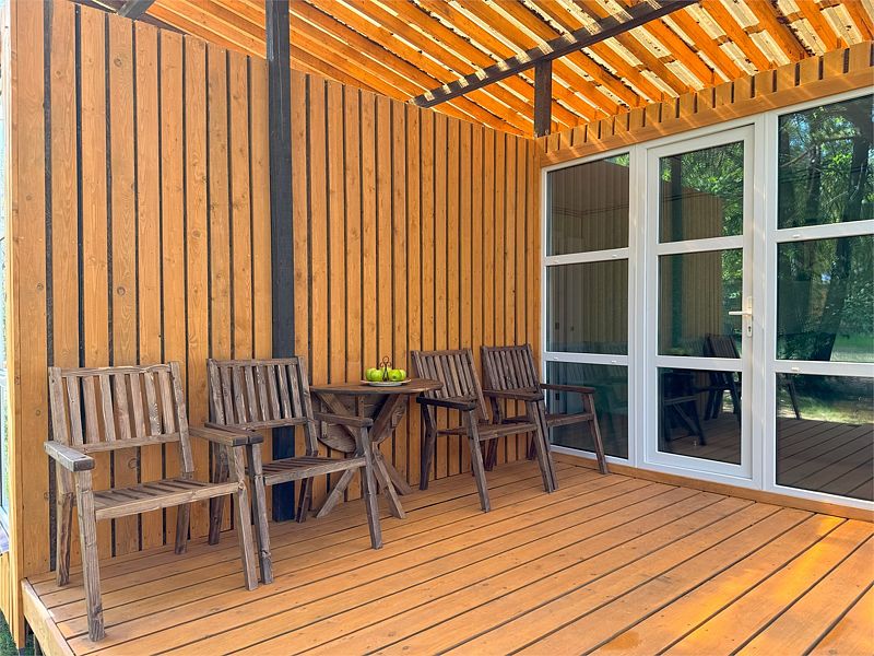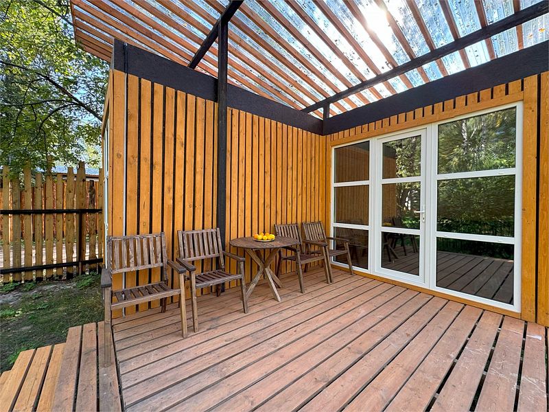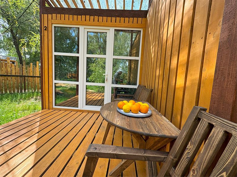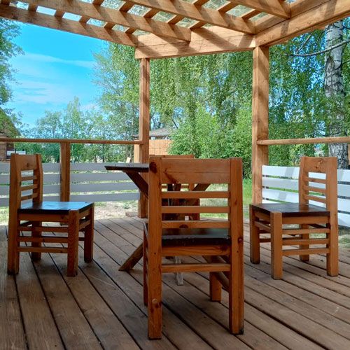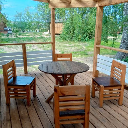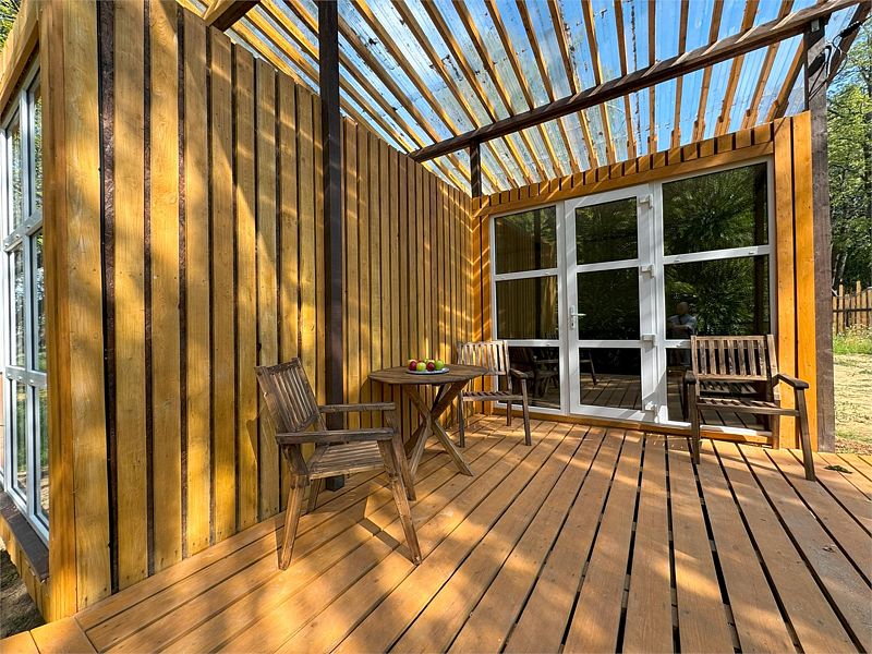 Веранда «Березовая» занимает центральное место на базе отдыха, предлагая вид на внутреннюю территорию глэмпинга. Это идеальное место для тех, кто хочет насладиться природой и атмосферой уюта, наслаждаясь тишиной и красотой окружающего ландшафта.