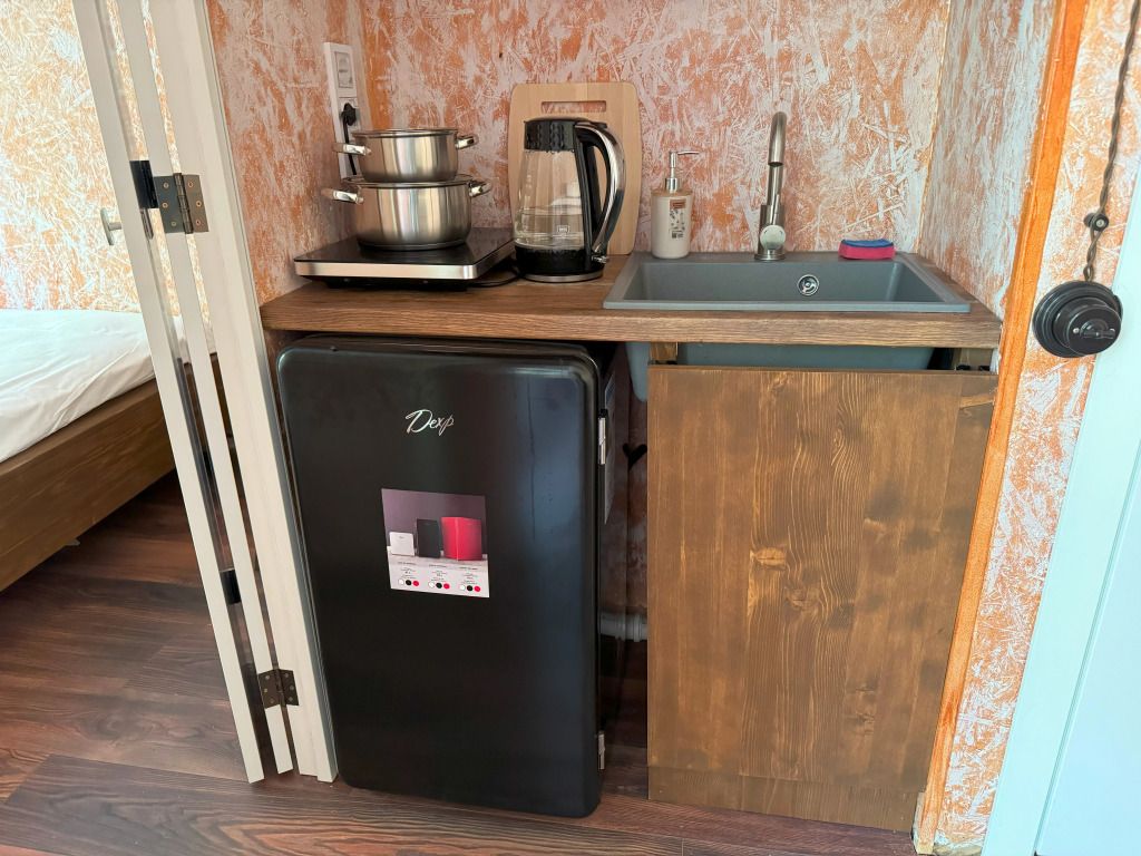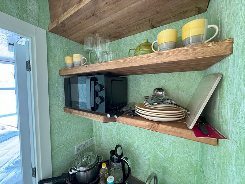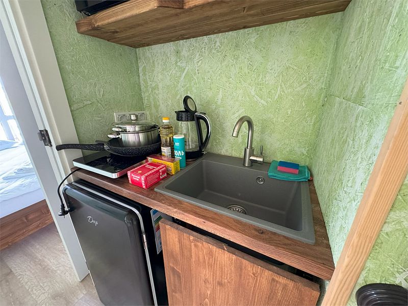 В каждом домике есть своя кухня со всей необходимой техникой и посудой.
