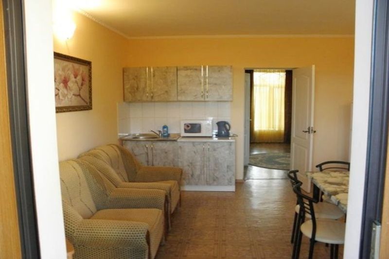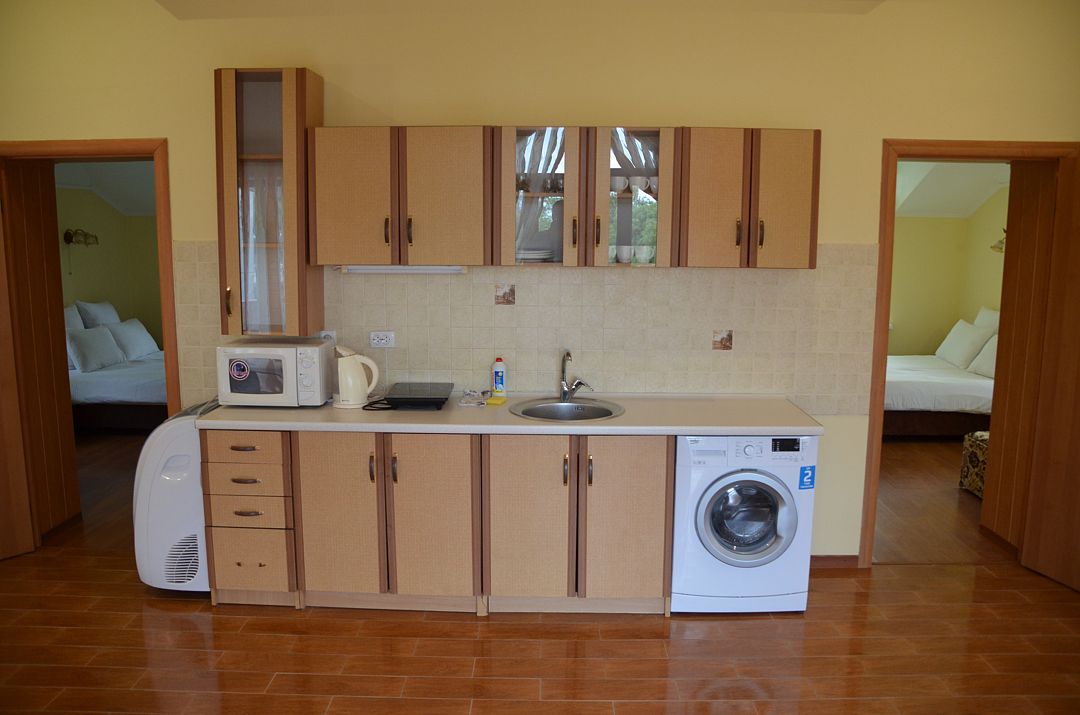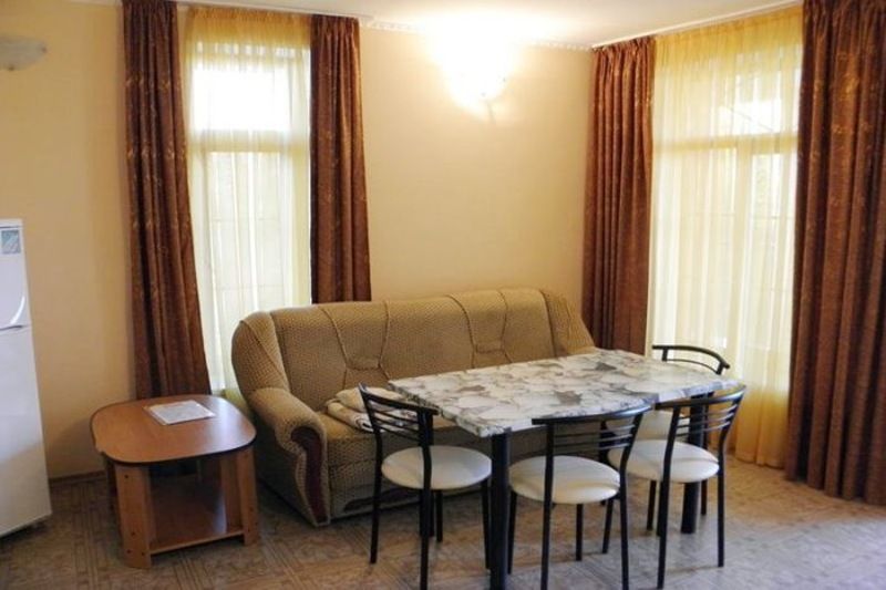 2-х комнатный номер, рассчитанный на 4 человека. Одна из комнат – гостиная с оборудованной мини-кухней, вторая – спальня. В гостиной имеется: раскладной диван с двумя креслами, телевизор, кондиционер, сейф, беспроводной доступ к интернету, обеденный стол. Мини-кухня оборудована: индукционной плитой, микроволновой печью, холодильником, электрочайником, раковиной, необходимым набором посуды. В спальне есть: двуспальная кровать с прикроватными тумбочками, шкаф для вещей, москитная сетка. Санузел состоит из душа, унитаза и раковины, есть фен и полотенца. Предоставляется сушка для вещей. В холодное время года работает отопление и подогрев пола.