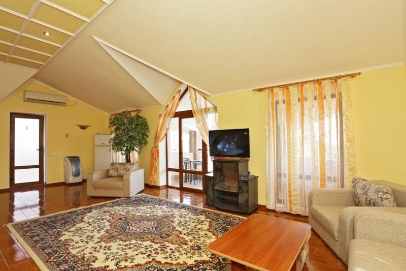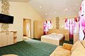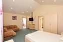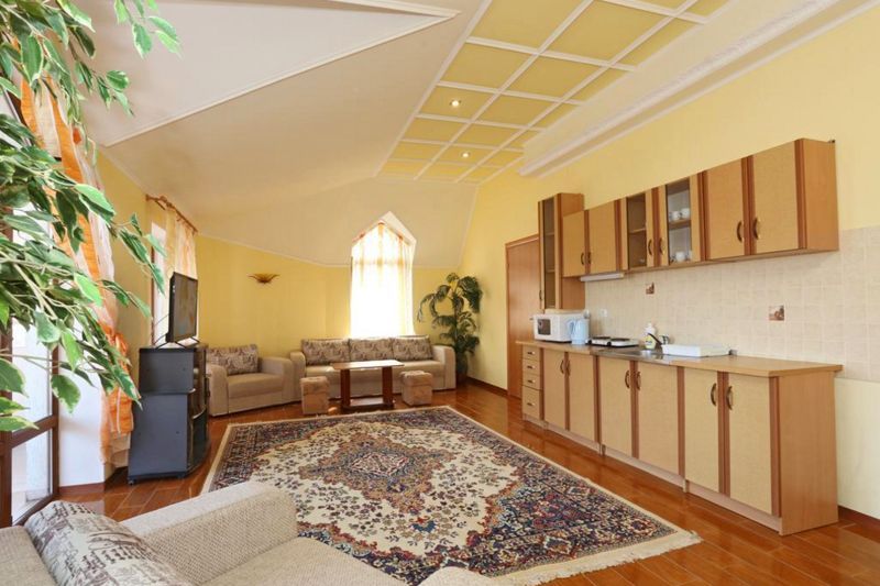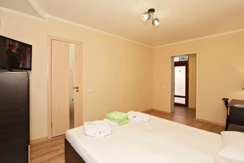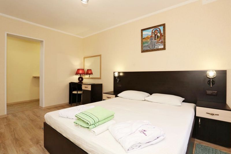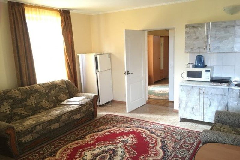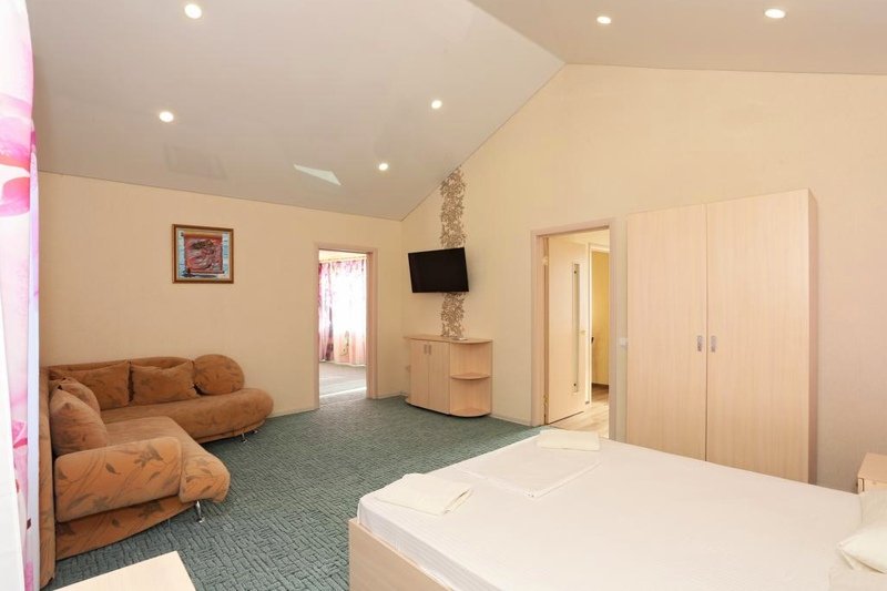 2-х комнатный номер, рассчитанный на 4 человека. Одна из комнат – гостиная с оборудованной мини-кухней, вторая – спальня. В гостиной имеется: раскладной диван с двумя креслами, телевизор, кондиционер, сейф, беспроводной доступ к интернету, обеденный стол. Мини-кухня оборудована: индукционной плитой, микроволновой печью, холодильником, электрочайником, раковиной, необходимым набором посуды. В спальне есть: двуспальная кровать с прикроватными тумбочками, шкаф для вещей, москитная сетка. Санузел состоит из душа, унитаза и раковины, есть фен и полотенца. Предоставляется сушка для вещей. В холодное время года работает отопление и подогрев пола.Спальные места