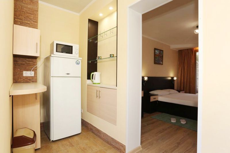 Номер обустроен компактно и уютно: двуспальная кровать с прикроватными тумбочками, раскладной диван, телевизор, сейф, кондиционер, беспроводной доступ к интернету, шкаф для вещей, письменный стол, сушка для вещей, москитная сетка. Комната совмещена с небольшой функциональной кухней, где есть микроволновая печь, электрический чайник, холодильник, индукционная плита, раковина и набор посуды. Санузел состоит из душа, умывальника и унитаза, есть фен и полотенца. В номере имеется балкон с летней мебелью. В холодное время года работает отопление и подогрев пола.Спальные места