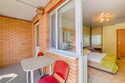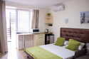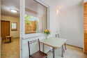 Мини-кухня укомплектована электрочайником, печью СВЧ, холодильником, кухонным столом и набором посуды, что позволяет самостоятельно приготовить любимые напитки или разогреть блюда. На балконе можно комфортно расположиться с утренним кофе или вечерним бокалом вина.
