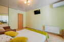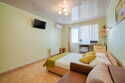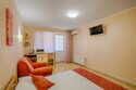 В комнате есть двуспальная кровать с ортопедическими матрасам, кресло-кровать, прикроватные тумбочки, шкаф-купе с зеркалом в полный рост, плазменный телевизор.