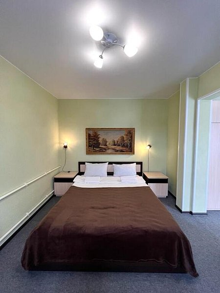 Однокомнатный номер с двуспальной кроватью размером 160*200 и площадью около 20 м2. В номере есть холодильник, плазменный ТВ с функцией Smart, Wi-Fi, бутилированная вода (бесплатно). В ванной комнате установлена душевая кабина, имеются средства личной гигиены, фен, тапочки.