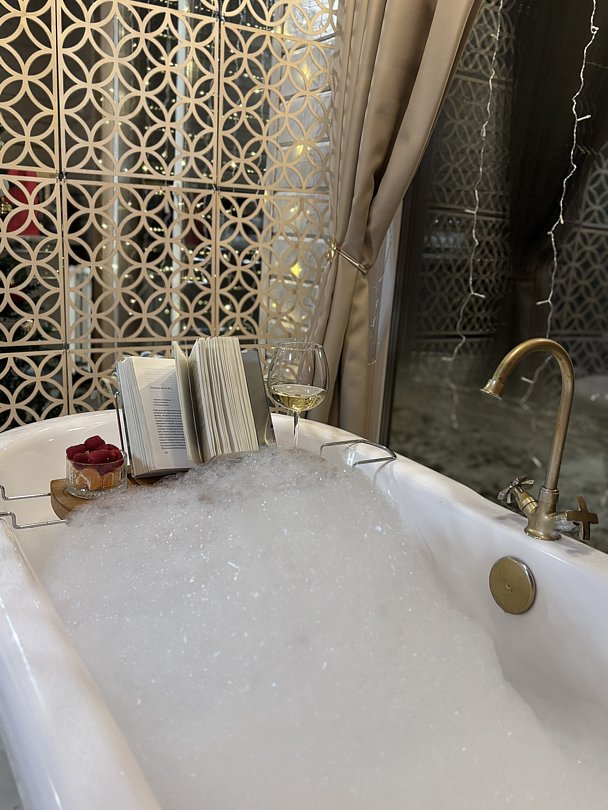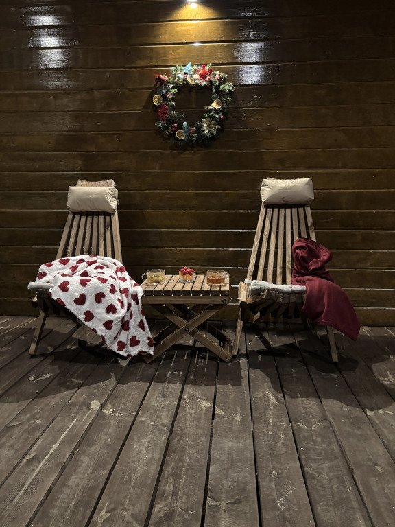В зимнее время года горячий чан доступен только с баней. Чан расположен в приватной spa-зоне, рядом с баней, в отдалении от домиков, вмещает до 4-х человек.