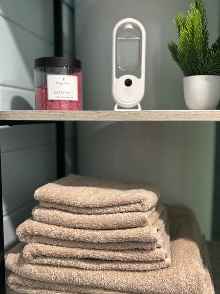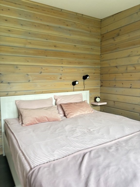Двуспальная кровать в спальне, раскладной диван в гостиной. Дом укомплектован посудой и гигиеническими принадлежностями. Комплект полотенец предоставляется для каждого гостя, как и постельные принадлежности с личным одеялом. Подходит для людей, страдающих от аллергии.