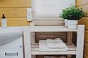 В бане 2 отделения: парная и предбанник. В предбаннике удобные лавочки, стол, чайник, заварочный чайник +кружки, кувшин с водой, травяные чаи, простыни, полотенца. В парной можно облиться водой, париться и любоваться панорамным видом на лес через 3D окно.