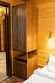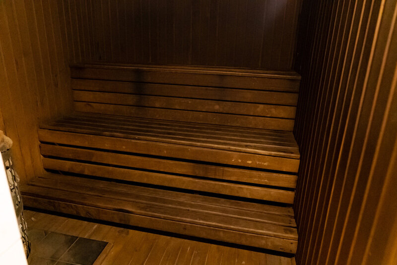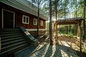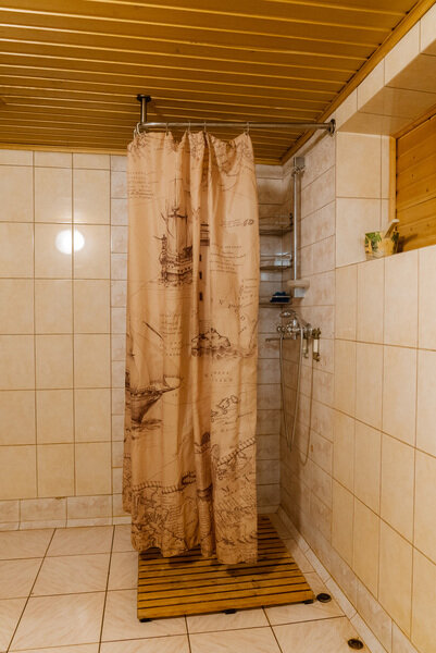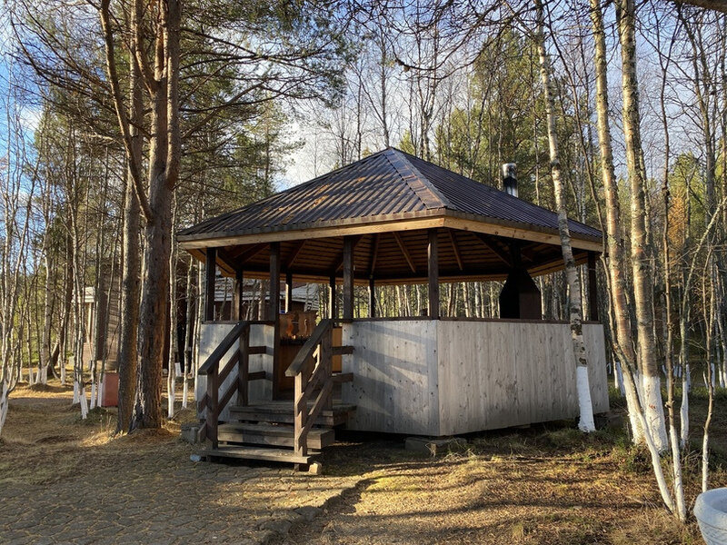 Купель расположена рядом с дровяной баней, где можно оставить вещи и воспользоваться уборной. Рядом с баней и купелью находится спуск по лестнице на пирс.