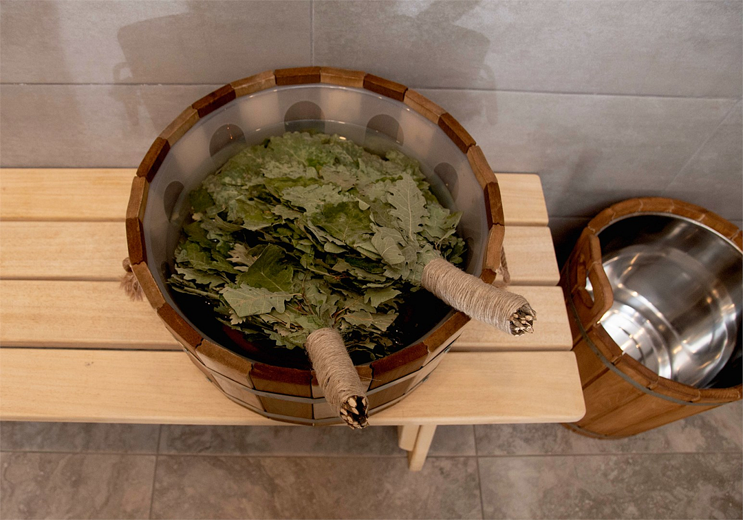 Инфраструктура: тапочки, купель, зона отдыха, полотенца, простыни, шапочки, обливное ведро, душ, халатыБаня