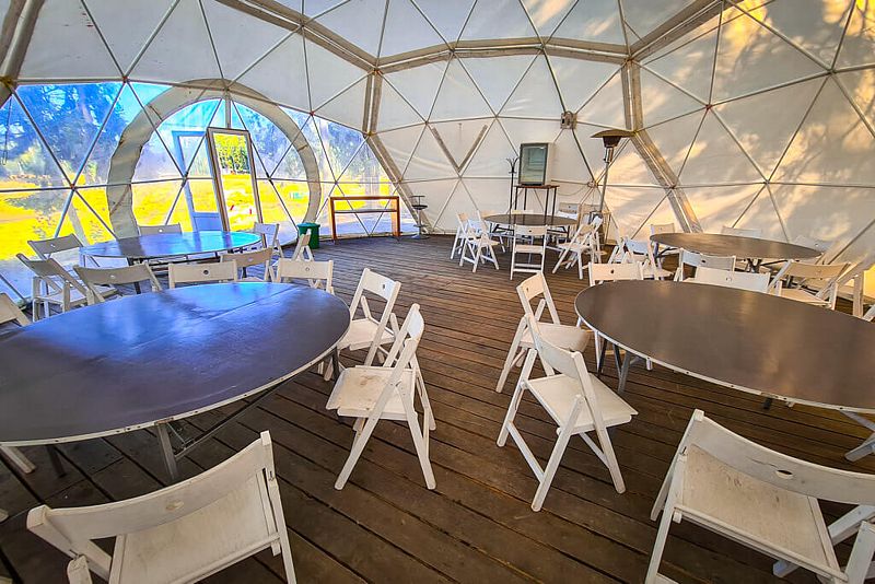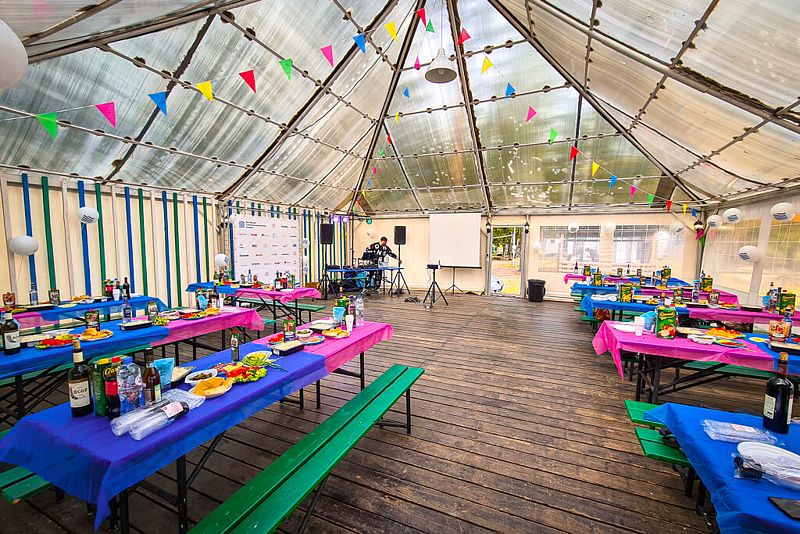 - Газовый обогреватель на случай непогоды, круглые столы и деревянные стулья для всех гостей.