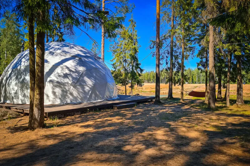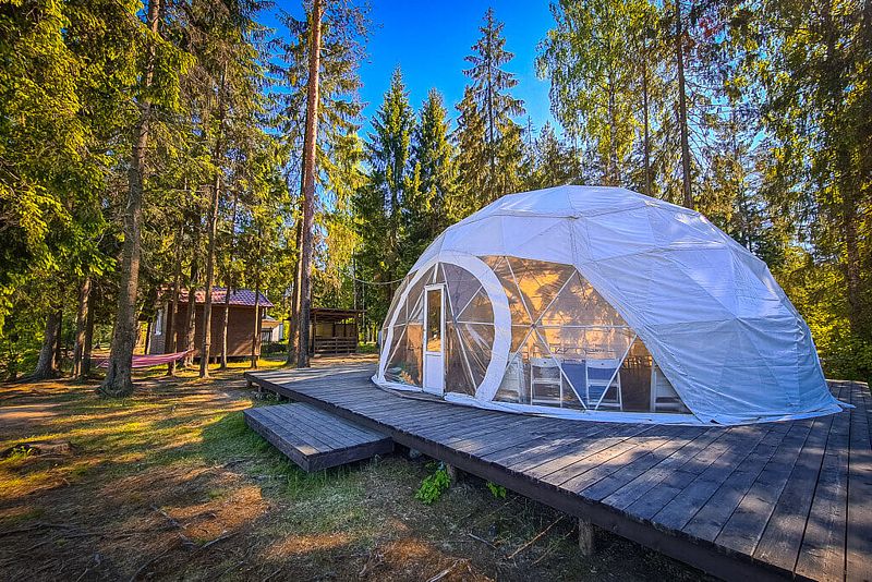 - Шатер с прозрачной панорамой, террасой и видом на песчаный каньон с небольшим озером.