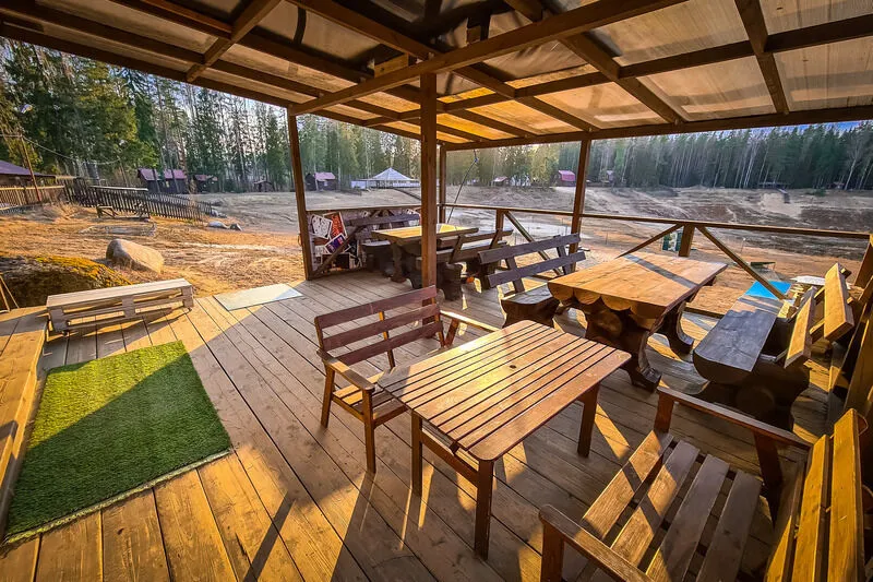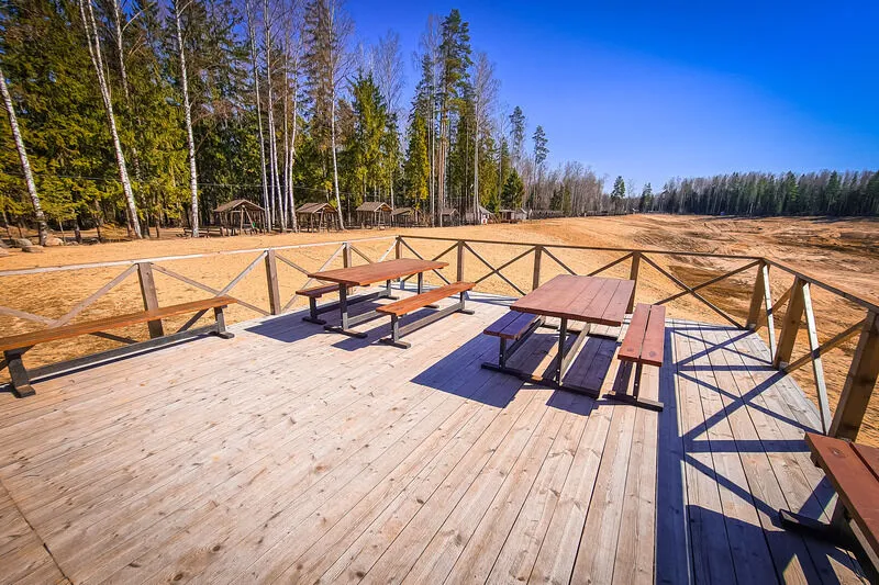 Имеется парковка. В местах отдыха на свежем воздухе установлены беседки разной степени комфортности, шатры, вместительная крытая столовая. Проложены дорожки. Оборудованы места для курения.