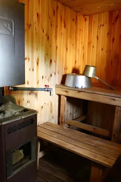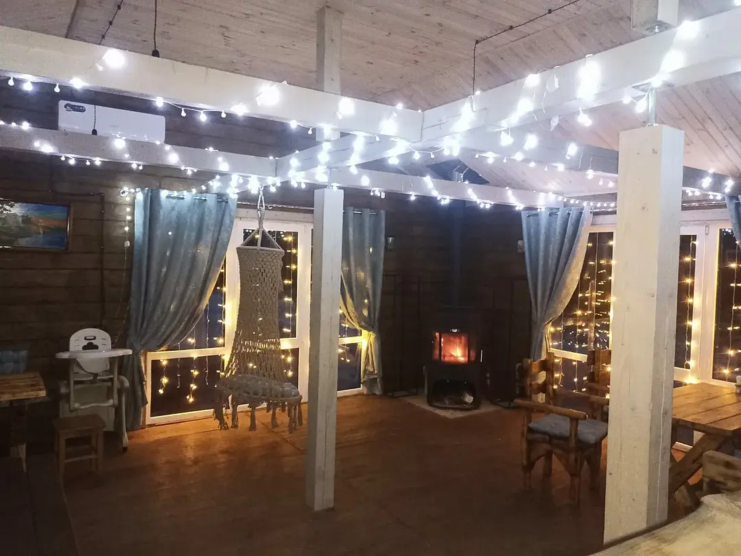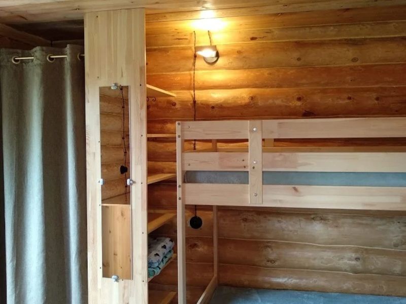- 4 домика для гостей. Все рубленные из хвойных пород дерева. В каждом домике: от 3х до 4х спальных мест, шкаф, стол, стулья, чайник, холодильник, постельное белье. В трёх домиках есть камины и электрические конвекторы, в одном только электрический конвектор.