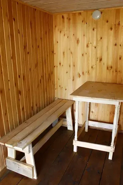 - Баня . Есть небольшая зона отдыха со столом и лавочками, а так же веранда для отдыха в летнее время.
