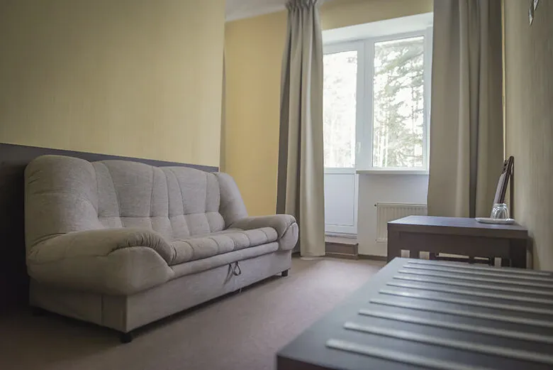 Гостиная номера "полулюкс". В комнате: Диван раскладной, столик для багажа, журнальный столик, шкаф-гардероб, холодильник, выход на балкон, напольное покрытие — ковролин.
