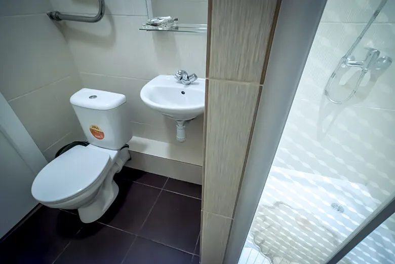 Санузел номера "полулюкс". Душевая кабина, унитаз, умывальник, электровытяжка, напольное покрытие — плитка.