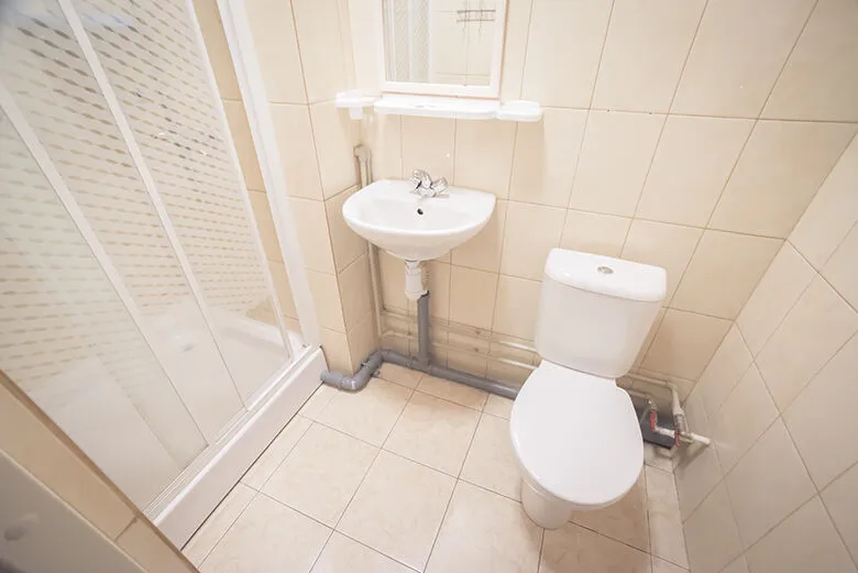 Душевая кабина, унитаз, умывальник, напольное покрытие — плитка.