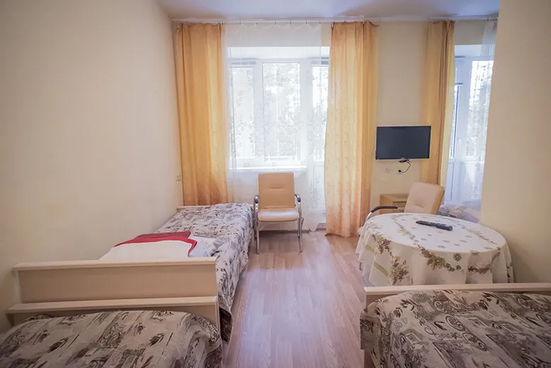 Трехместный номер 3 кровати по 80 см Телевизор 32 д. с возможностью подключения по USB и HDMI Шкаф Тумбочки Стол Холодильник Туалетные принадлежности Полотенца Выход на балкон или на собственный выход на улицу(зависит от этаджа)Услуги и удобства