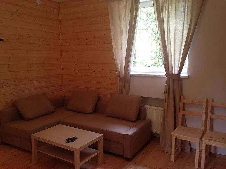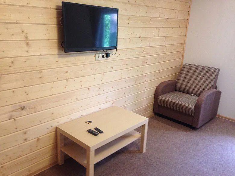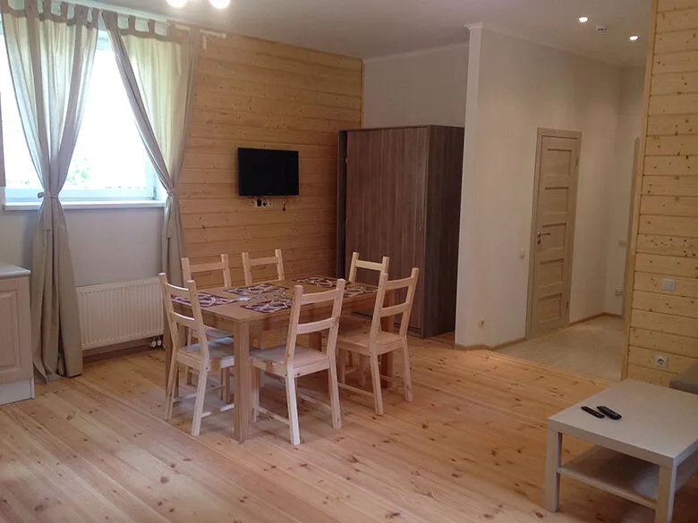 Гостиная коттеджа: Кухня со всей необходимой бытовой техникой (холодильник, электроплита, микроволновая печь, электрочайник), вся необходимая посуда для готовки и приёма пищи, обеденный стол, стулья, диван угловой (раскладной), шкаф-гардероб, ТВ-32 дюйма (цифровое телевидение), журнальный столик, напольное покрытие — сосна, так же в прихожей и санузле теплые полы.