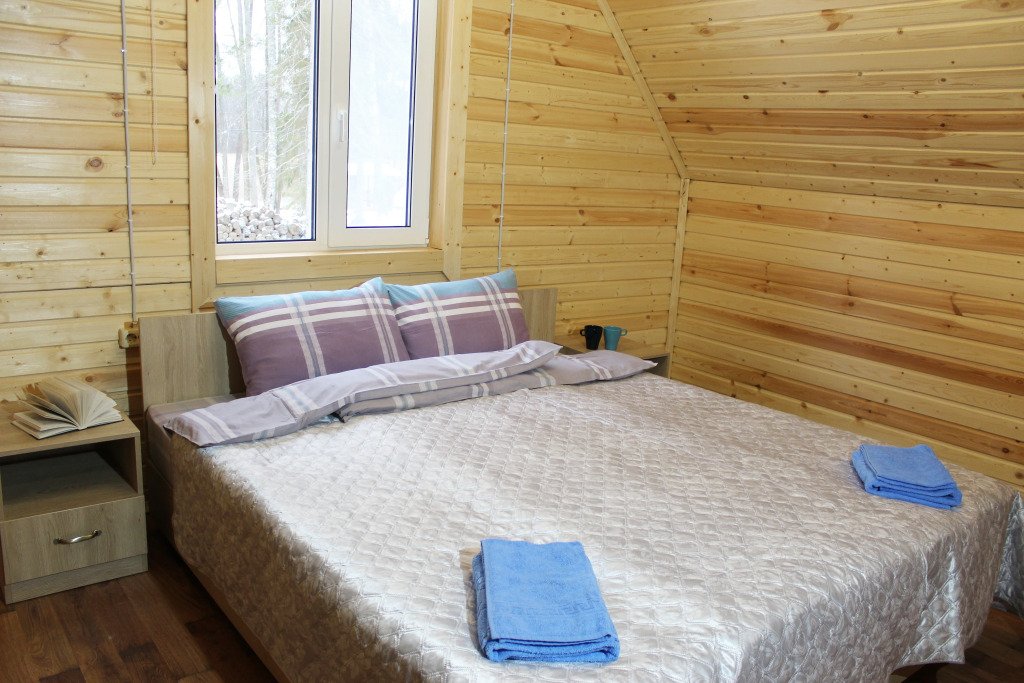Двухэтажные деревянные коттеджи с тремя спальнями, в каждой из которых расположены по две односпальные кровати, которые при желании трансформируются в одну двуспальную, а также прикроватные тумбы и комод.