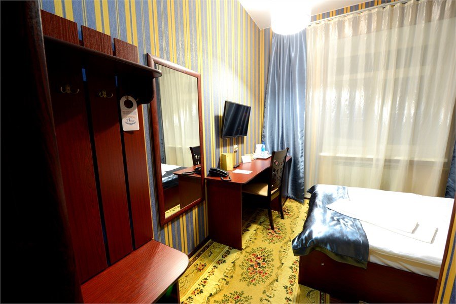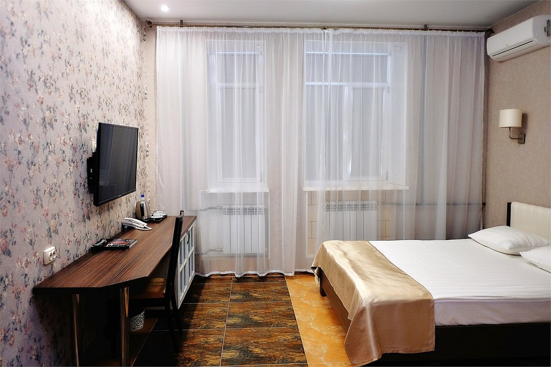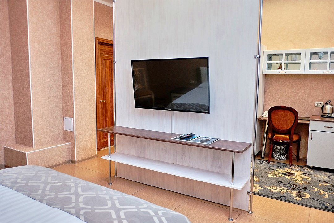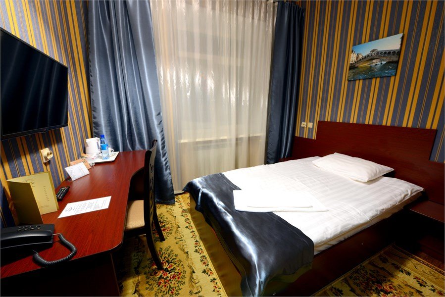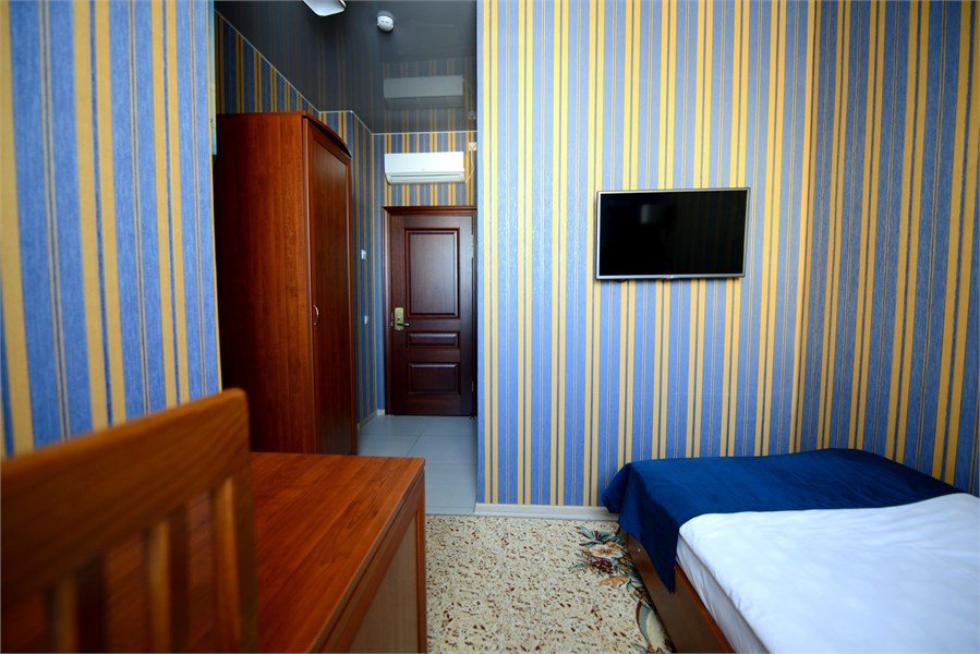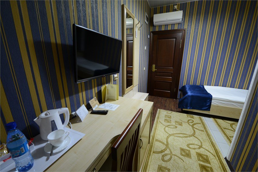 телевизор, кабельное телевидение, Wi-Fi, телефон, кондиционер, светильник, фен, электронные замки, ванна или душевая кабина, санузел, банные полотенца, тапочки, гигиенические средства, полутораспальная кровать, тумбы, стулья, шкаф для одежды, вешалки, письменный стол, зеркало, ковер, мини-бар, чайный набор, чайник, раковина, питьевая водаВ номере