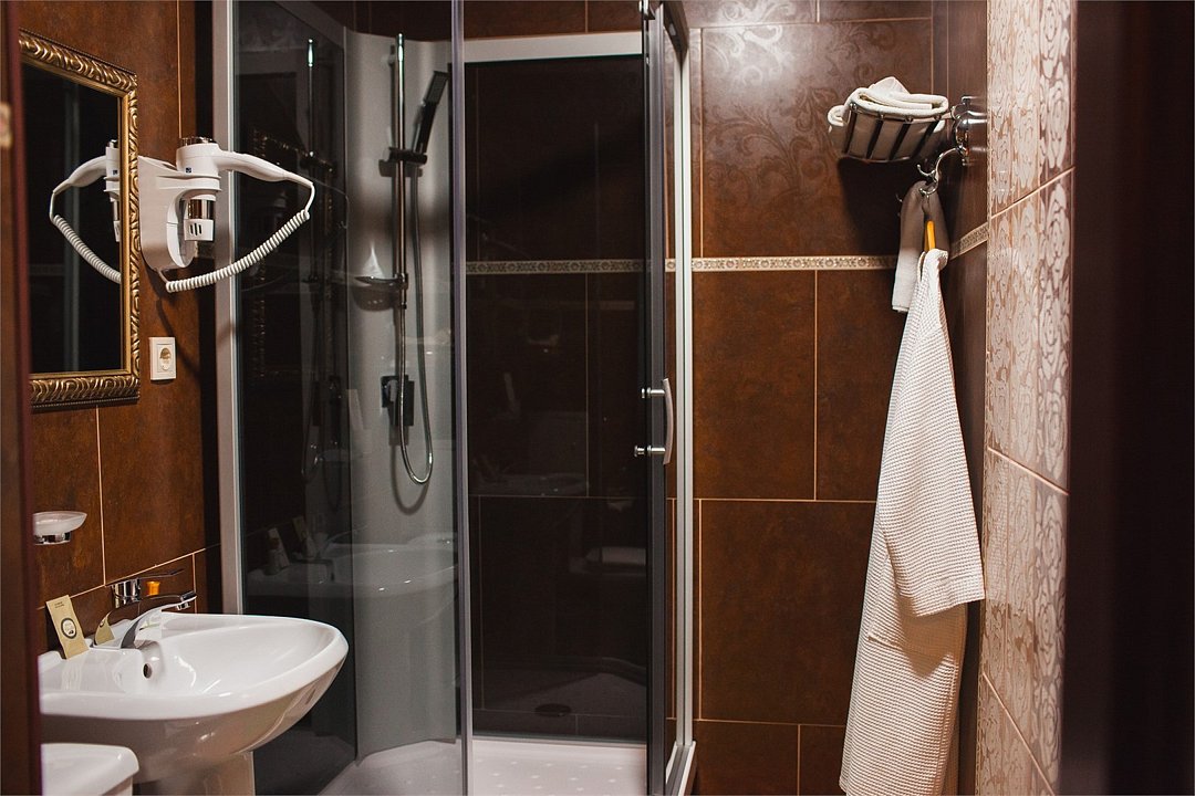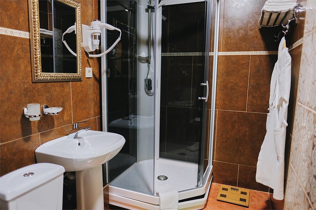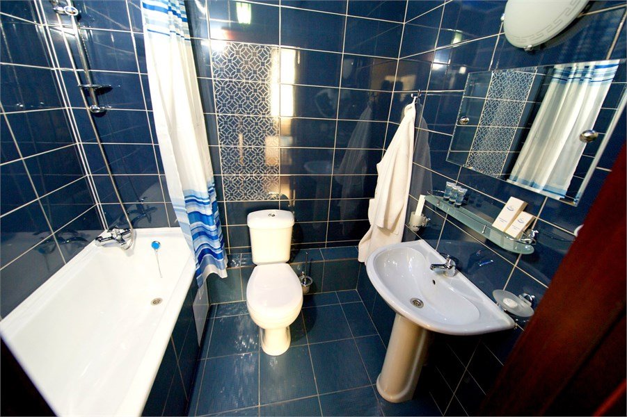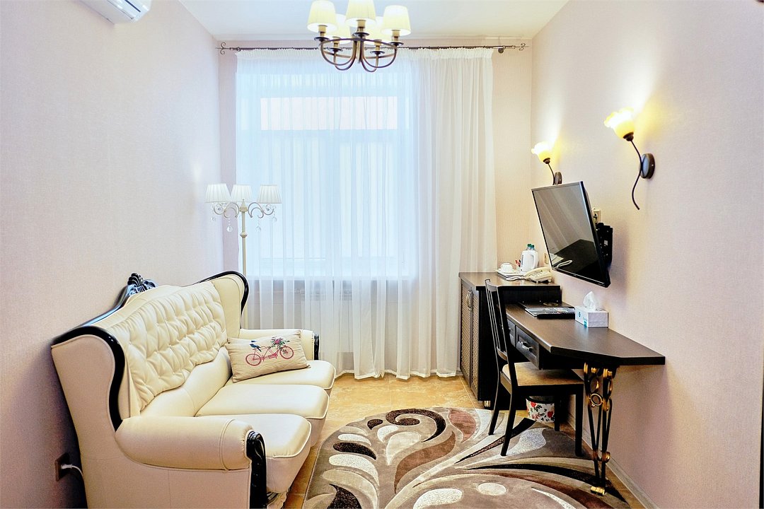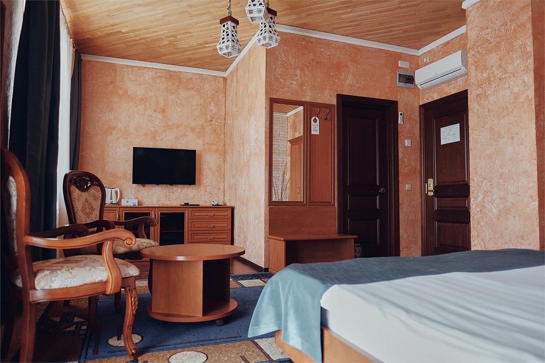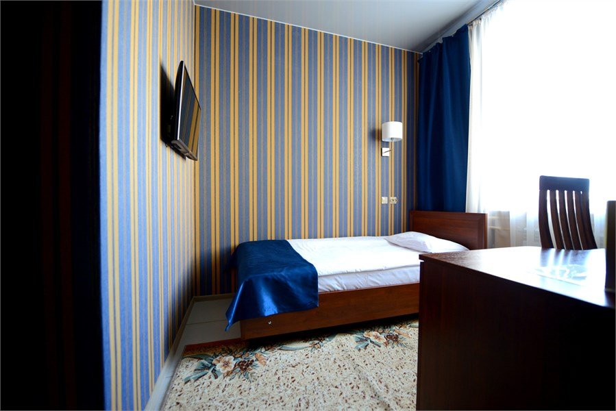 телевизор, кабельное телевидение, Wi-Fi, телефон, кондиционер, светильник, фен, электронные замки, ванна или душевая кабина, санузел, банные полотенца, тапочки, гигиенические средства, полутораспальная кровать, тумбы, стулья, шкаф для одежды, вешалки, письменный стол, зеркало, ковер, мини-бар, чайный набор, чайник, раковина, питьевая водаВ номере