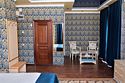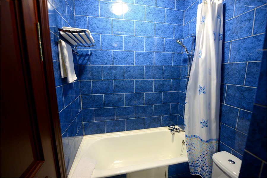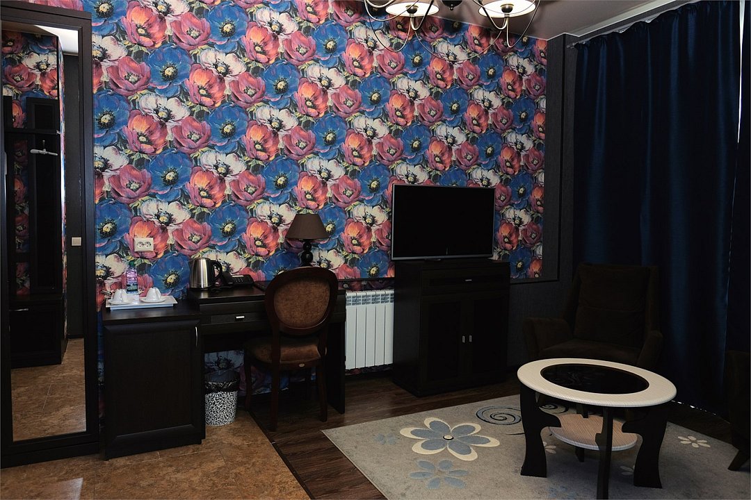 телевизор, кабельное телевидение, Wi-Fi, кондиционер, светильник, фен, электронные замки, ванна или душевая кабина, санузел, халаты, тапочки, гигиенические средства, косметические средства, двуспальная кровать, кресла, тумбы, стулья, шкаф для одежды, журнальный столик, письменный стол, зеркало, ковер, мини-бар, чайный набор, чайник, унитаз, раковина, питьевая вода, отопление, креслоВ номере