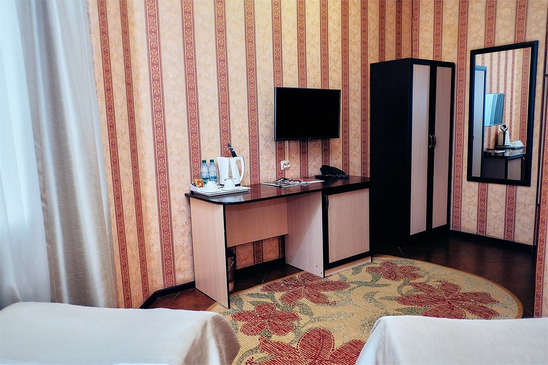 телевизор, кабельное телевидение, Wi-Fi, телефон, кондиционер, светильник, фен, электронные замки, ванна или душевая кабина, санузел, банные полотенца, тапочки, гигиенические средства, две односпальные кровати, тумбы, стулья, шкаф для одежды, вешалки, письменный стол, зеркало, ковер, мини-бар, чайный набор, чайник, раковина, питьевая вода, отоплениеВ номере
