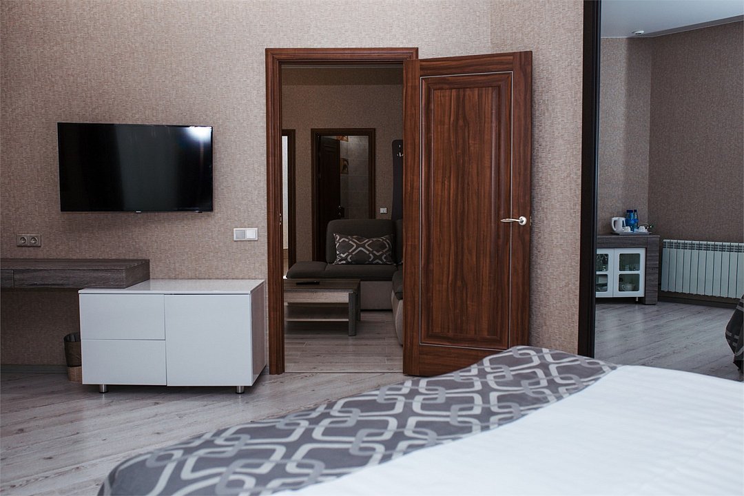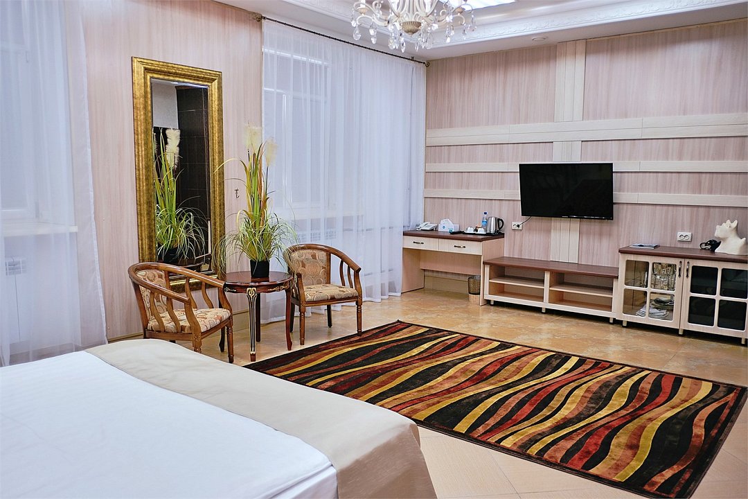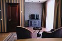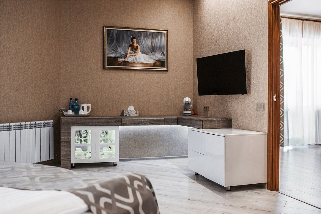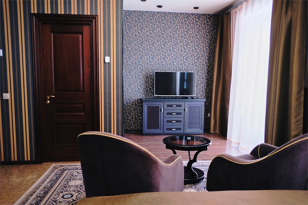 телевизор, кабельное телевидение, Wi-Fi, кондиционер, светильник, фен, электронные замки, душевая кабина, ванная с джакузи, санузел, халаты, банные полотенца, тапочки, гигиенические средства, сауна, балкон, двуспальная кровать, диван, кресла, тумбы, стулья, шкаф для одежды, журнальный столик, письменный стол, ковер, мини-бар, чайный набор, набор посуды, чайник, питьевая вода, отопление, вид на городВ номере
