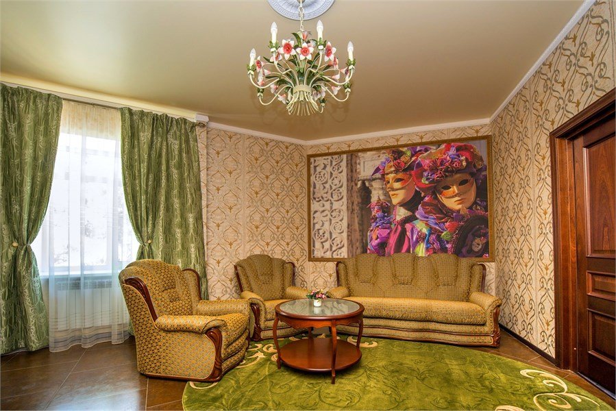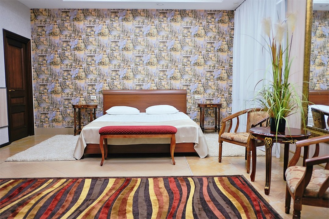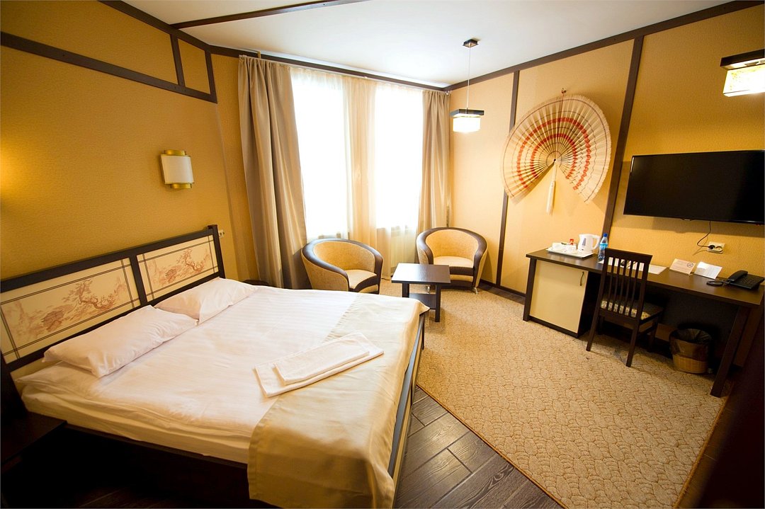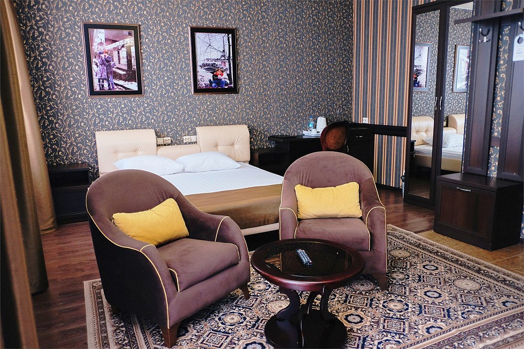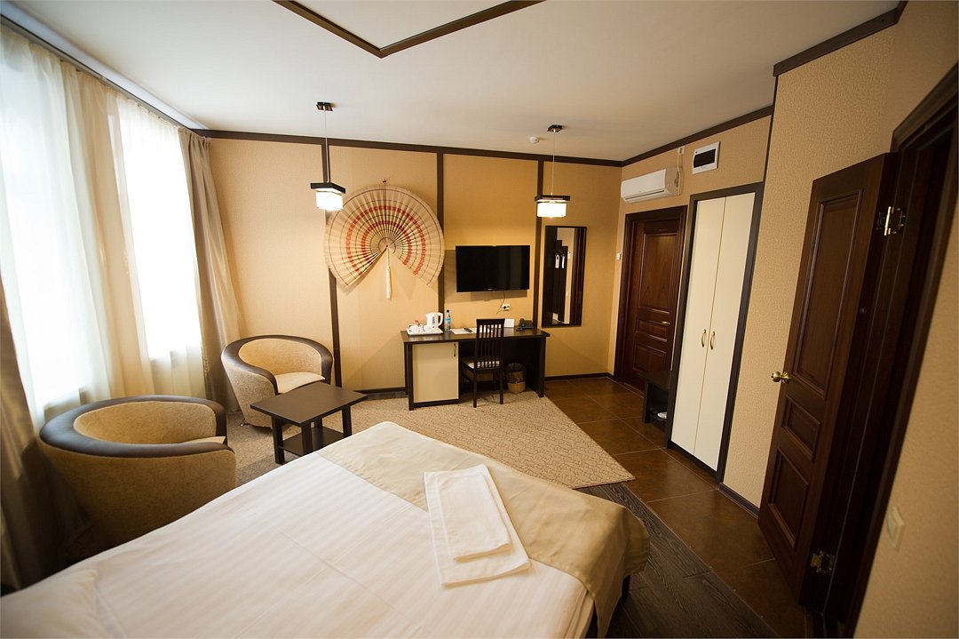 телевизор, кабельное телевидение, Wi-Fi, кондиционер, светильник, фен, электронные замки, душевая кабина, ванная с джакузи, санузел, халаты, банные полотенца, тапочки, гигиенические средства, сауна, балкон, двуспальная кровать, диван, кресла, тумбы, стулья, шкаф для одежды, журнальный столик, письменный стол, ковер, мини-бар, чайный набор, набор посуды, чайник, питьевая вода, отопление, вид на городВ номере