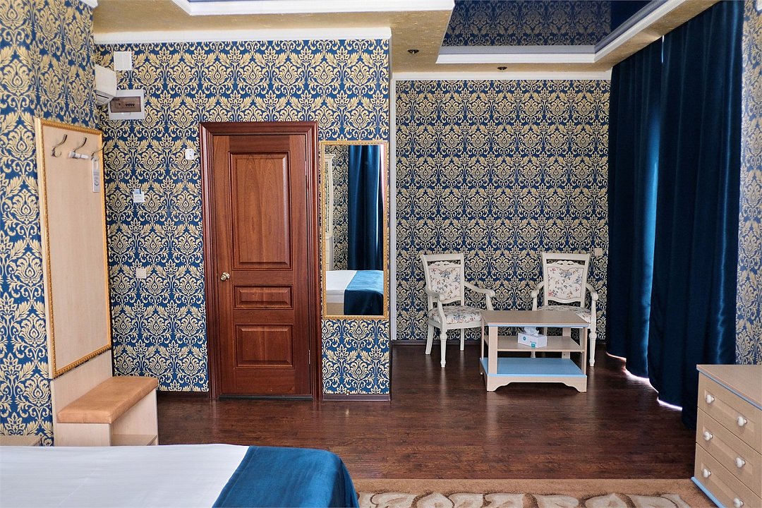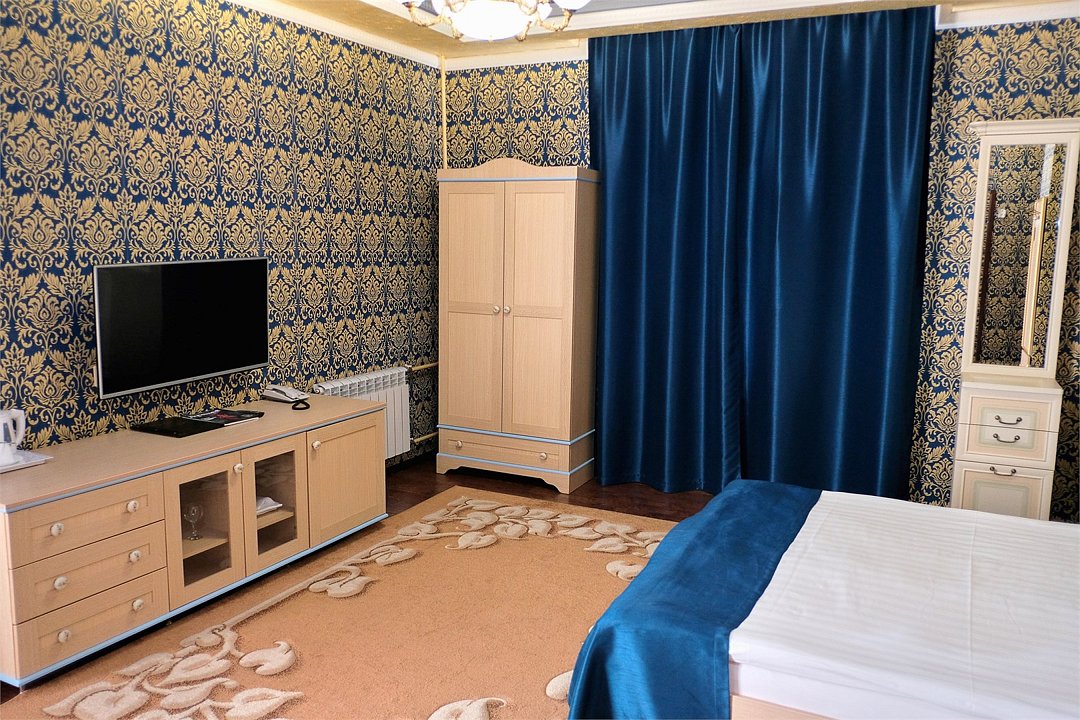 телевизор, кабельное телевидение, Wi-Fi, кондиционер, светильник, фен, электронные замки, ванна или душевая кабина, санузел, халаты, банные полотенца, тапочки, гигиенические средства, двуспальная кровать, кресла, стулья, шкаф для одежды, вешалки, письменный стол, зеркало, ковер, мини-бар, чайный набор, сейф, чайник, раковина, питьевая вода, отоплениеВ номере