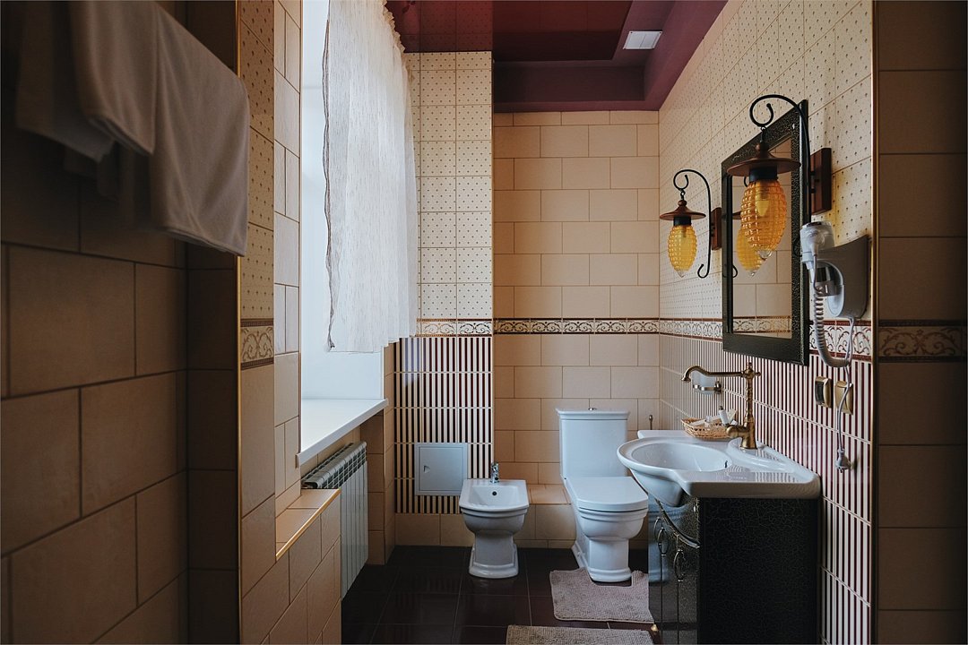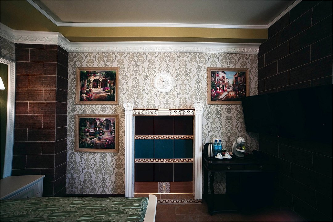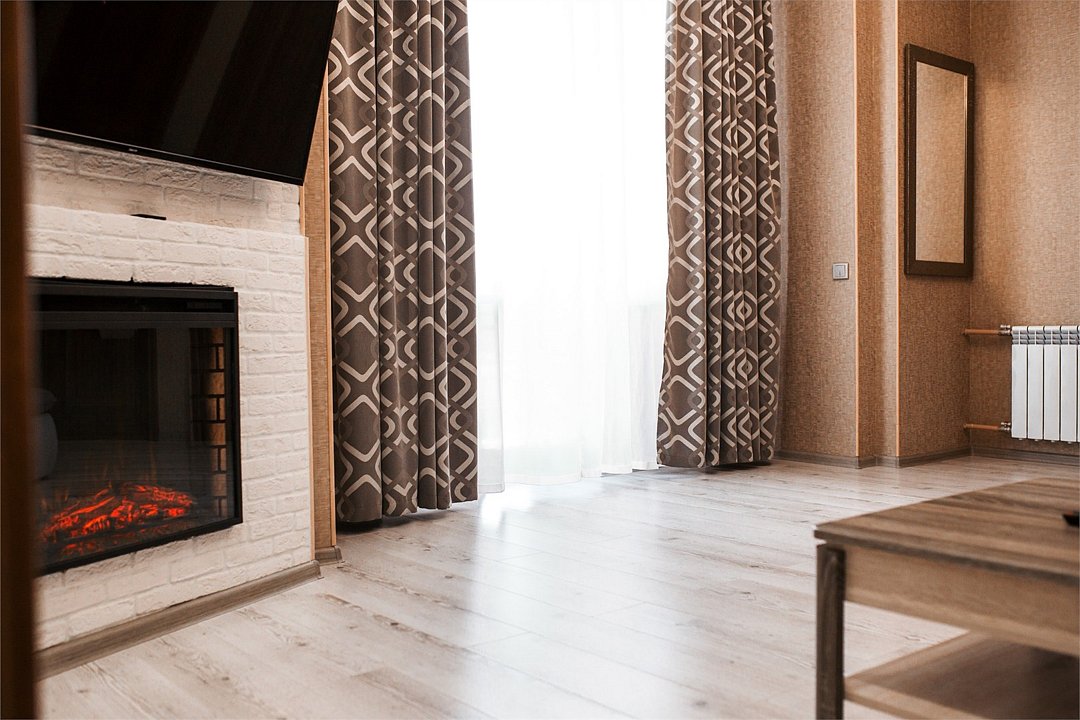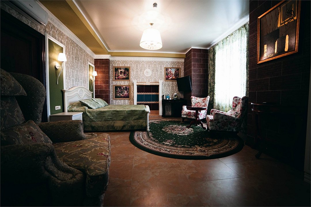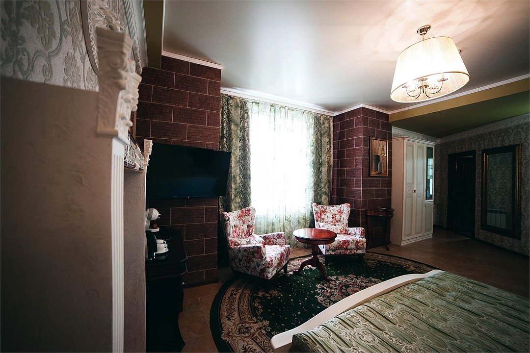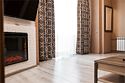 телевизор, кабельное телевидение, Wi-Fi, телефон, кондиционер, светильник, фен, электронные замки, ванная комната, дополнительный санузел, биде, халаты, тапочки, гигиенические средства, балкон, двуспальная кровать, диван, кресла, тумбы, стулья, шкаф для одежды, гардеробная, журнальный столик, письменный стол, зеркало, ковер, две комнаты, мини-бар, камин, чайный набор, набор посуды, сейф, чайник, раковина, питьевая вода, отопление, вид на городВ номере
