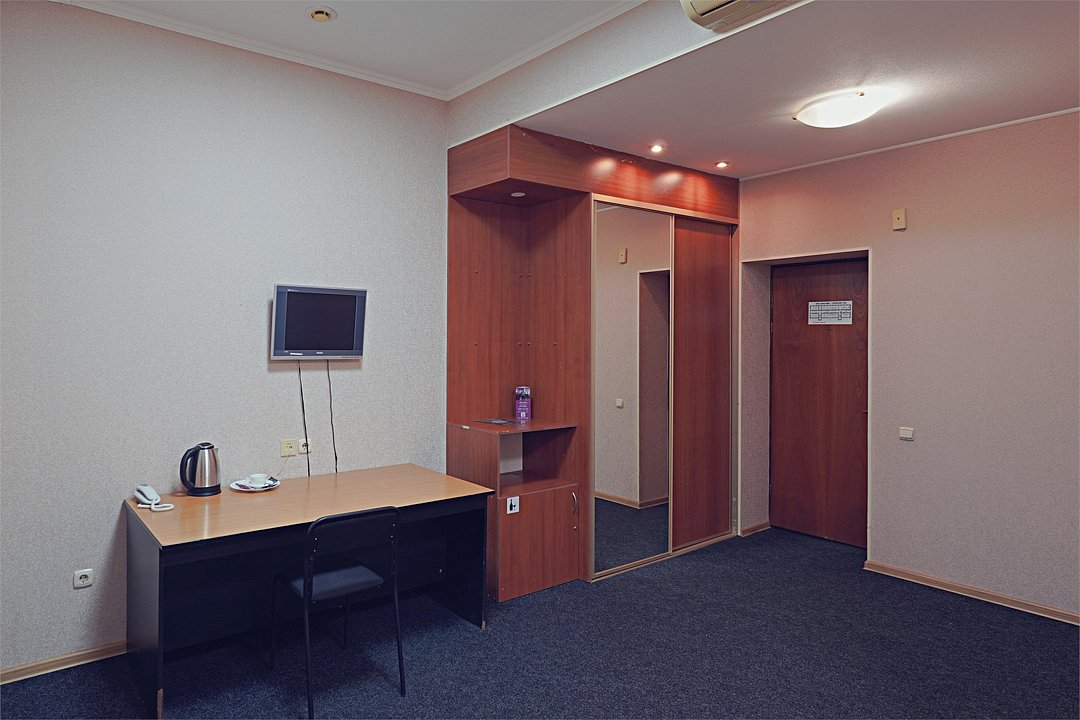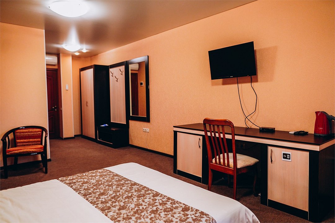 телевизор, Wi-Fi, кондиционер, светильник, ванна или душевая кабина, косметические средства, двуспальная кровать, шкаф для одежды, зеркало, вид на город, кулер на этаже, вид во двор, стул, туалетные средства, туалет, рабочий стол, без питомцевВ гостиничном номере