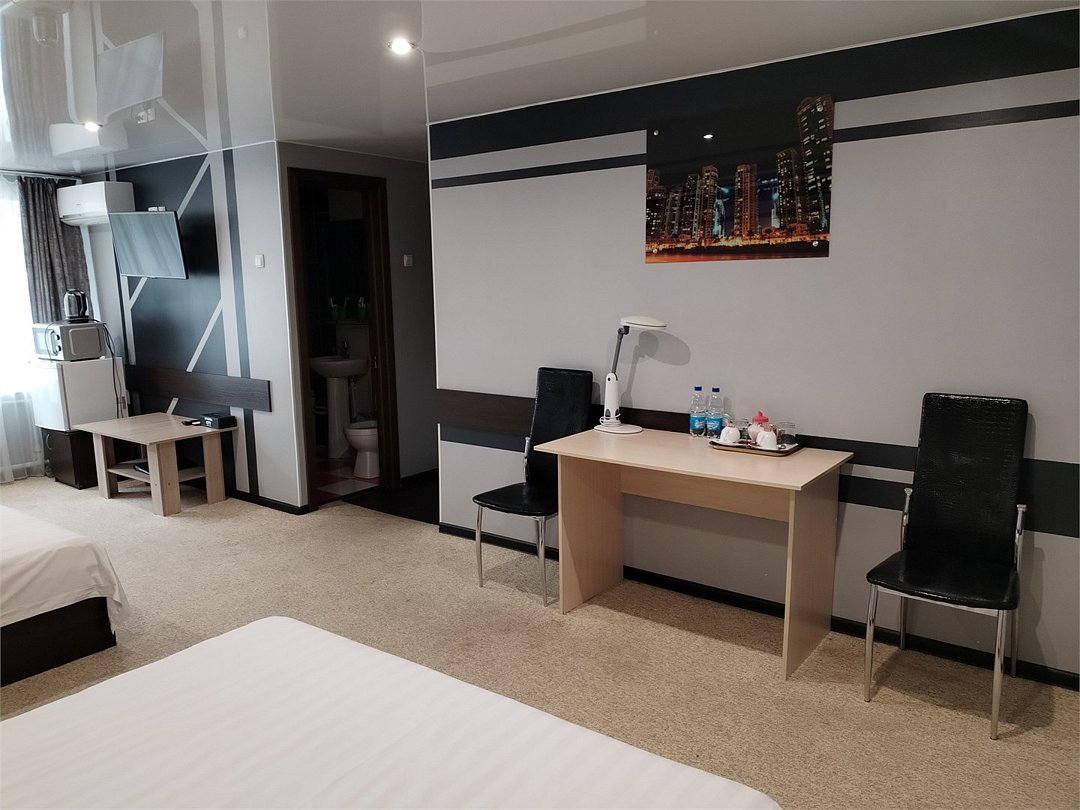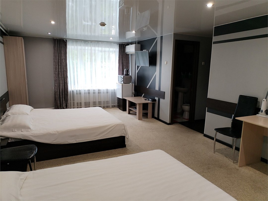 В номере: Две двуспальные кровати — 200 х 160 см. , письменный стол, шкаф д/одежды, тумба , холодильник, чайник, Совмещённый санузел (душевая кабина) , Беспроводной доступ в Интернет — Wi-Fi Кабельное телевидение с большим выбором каналов, набор для ванной: зубная щетка с пастой, набор д/бритья, швейный набор, косметический набор, мыло, шампунь, гель для душа, тапочки, вода бутилированная, чай, кофе, сахар.Услуги и удобства