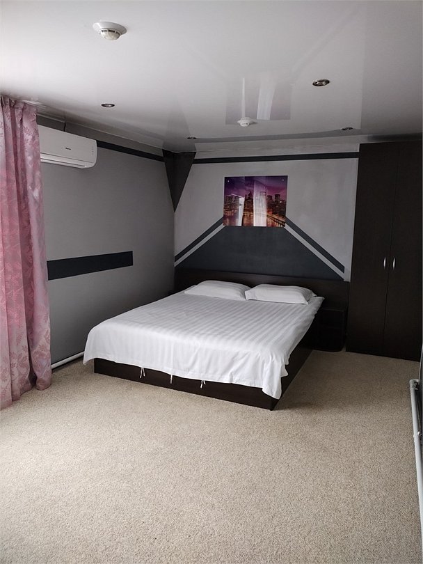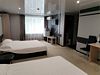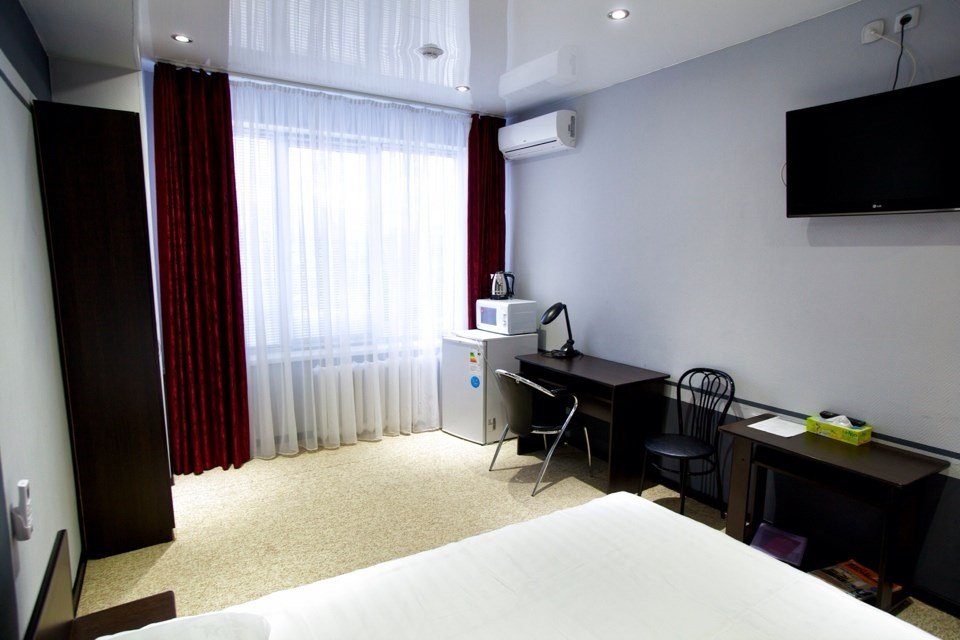 В номере: Двуспальная кровать — 200 х 160 , журнальный стол, тумба, Холодильник, чайник, кондиционер, совмещённый санузел (душевая кабина) Беспроводной доступ в Интернет — Wi-Fi Кабельное телевидение с большим выбором каналов Набор для ванной: зубная щетка с пастой, мыло, шампунь, гель для душа, разовые тапочки. Набор полотенецУслуги и удобства