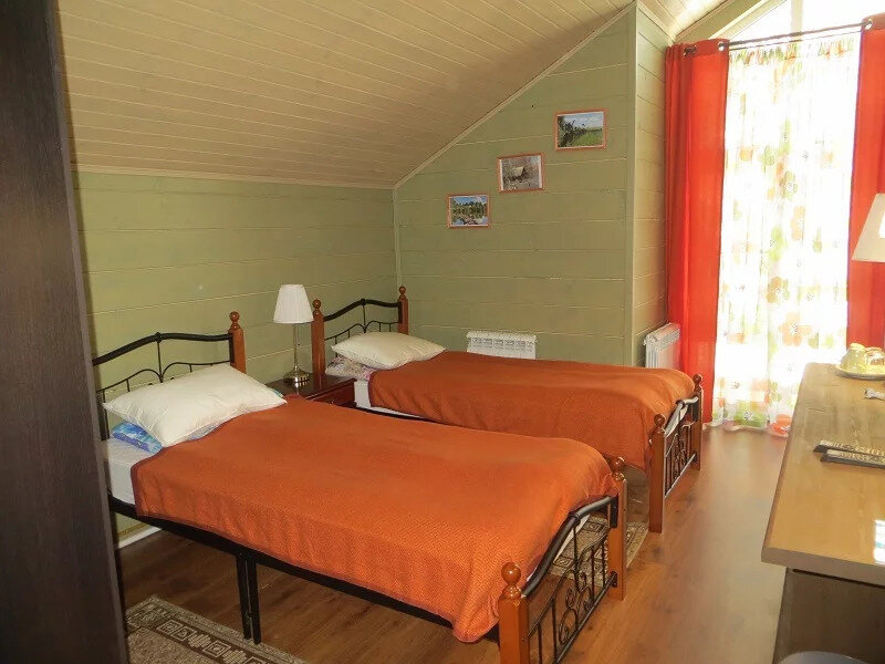 - Номер 2 — 17 кв.м., 2 односпальные кровати, 1 тумбочка, французский балкон, шкаф-гардероб.