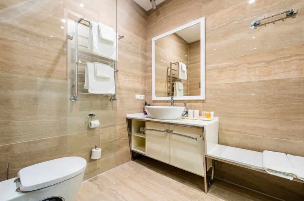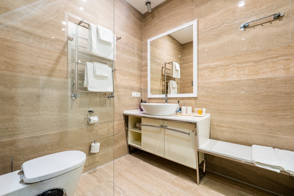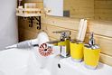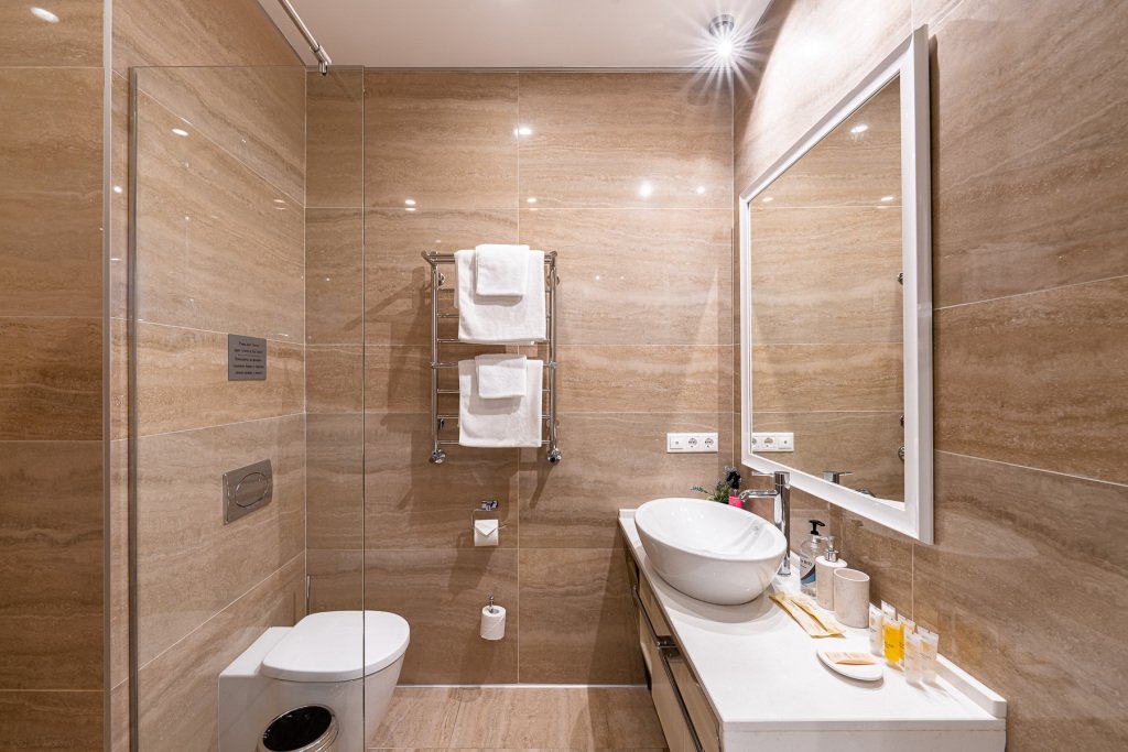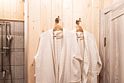 Ванная комната с косметическими принадлежностями, халатами, тапочками, феном и комплектом полотенец.
