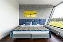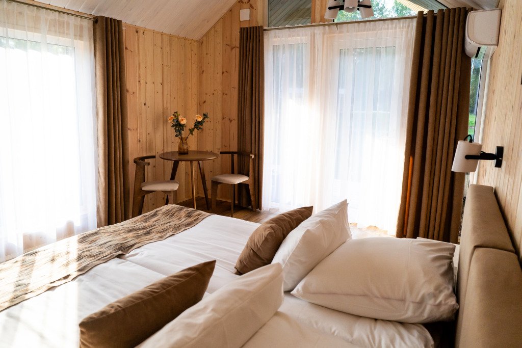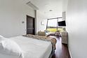 В панорамной спальне двуспальная кровать и двуспальный диван.