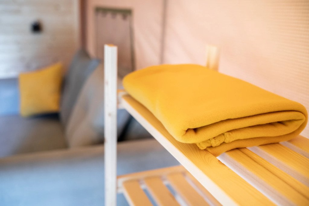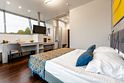 Дизайн, расположение и светлые тона создают неповторимую атмосферу от городской суеты. Если нужно продлить сон, штора блэкаут создаст для этого все условия.