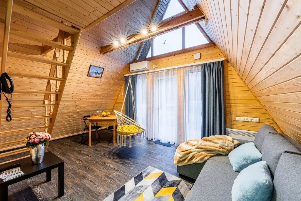 А-фреймы на восточном пруду имеют подвесную качель или оборудованы мини-кухней