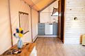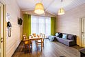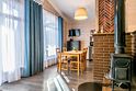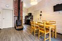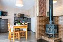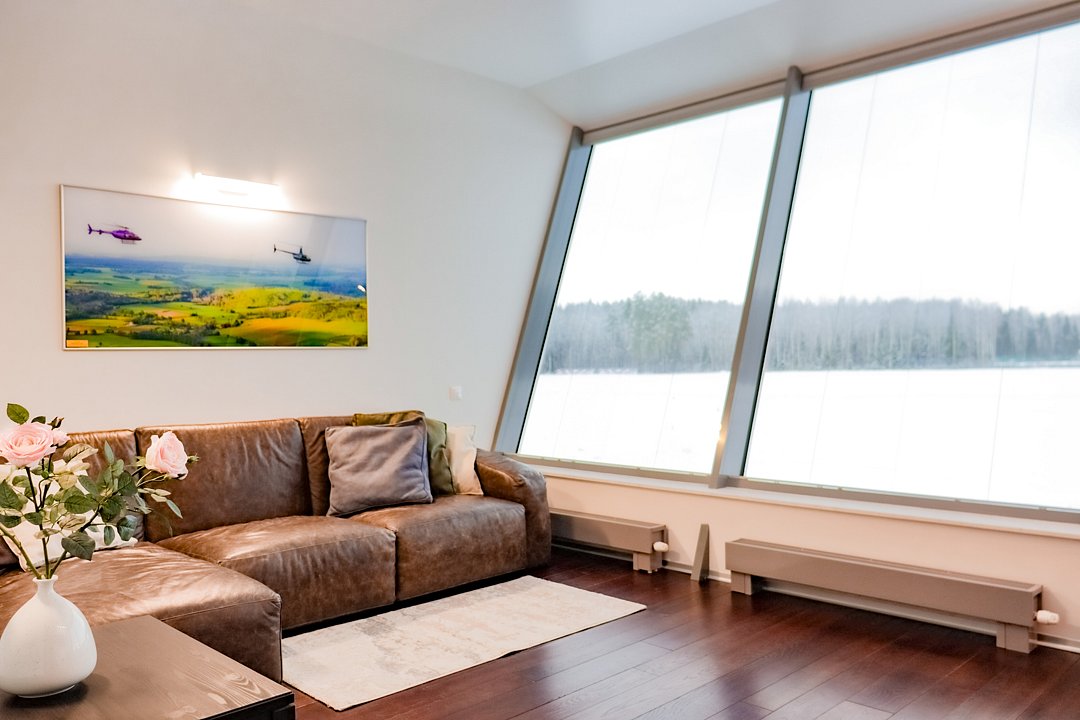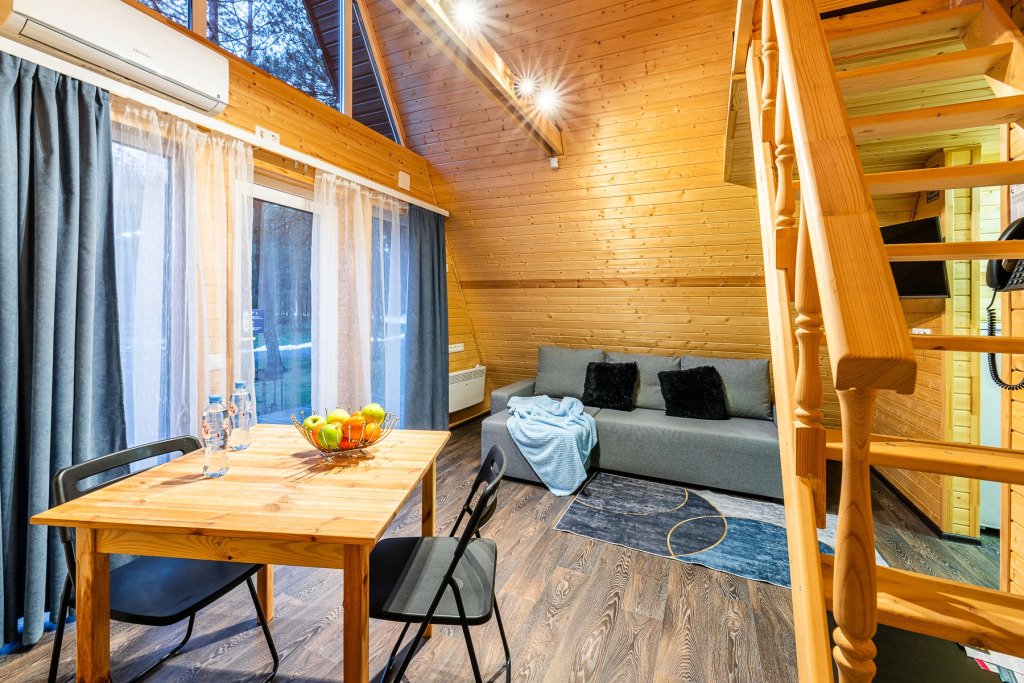 Уютная панорамная гостиная совмещенная с кухней и обеденным столом на 6 персон. Выход к костровой зоне и на балкон.