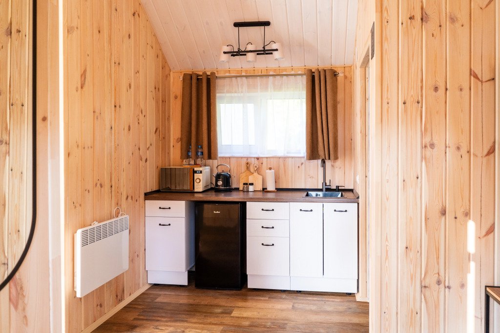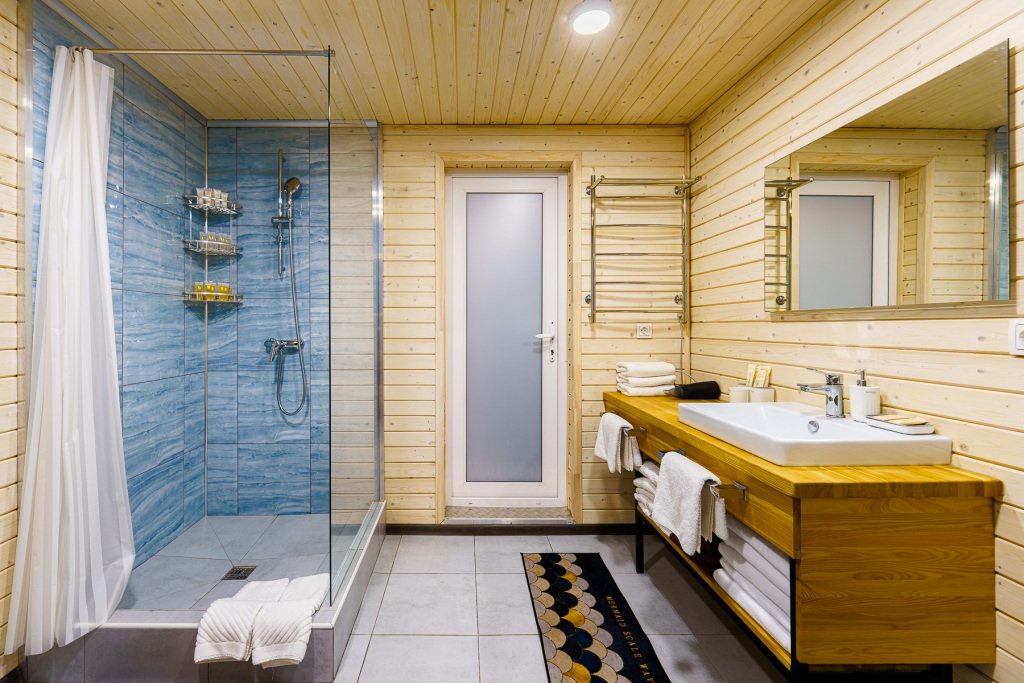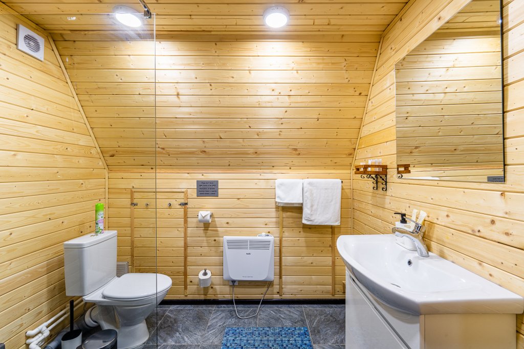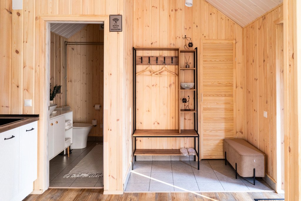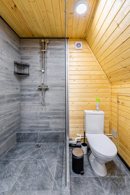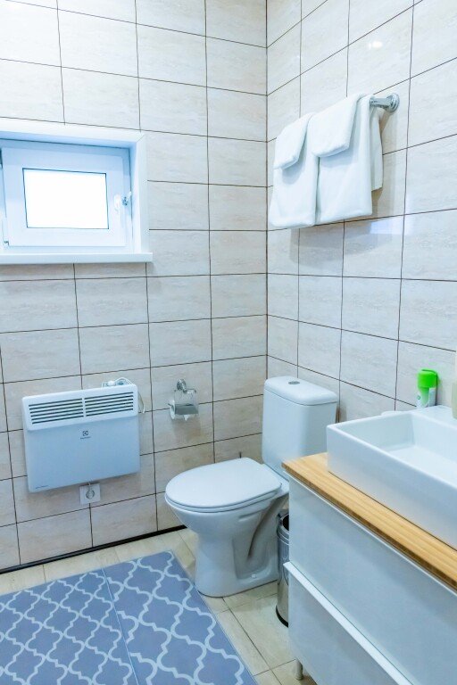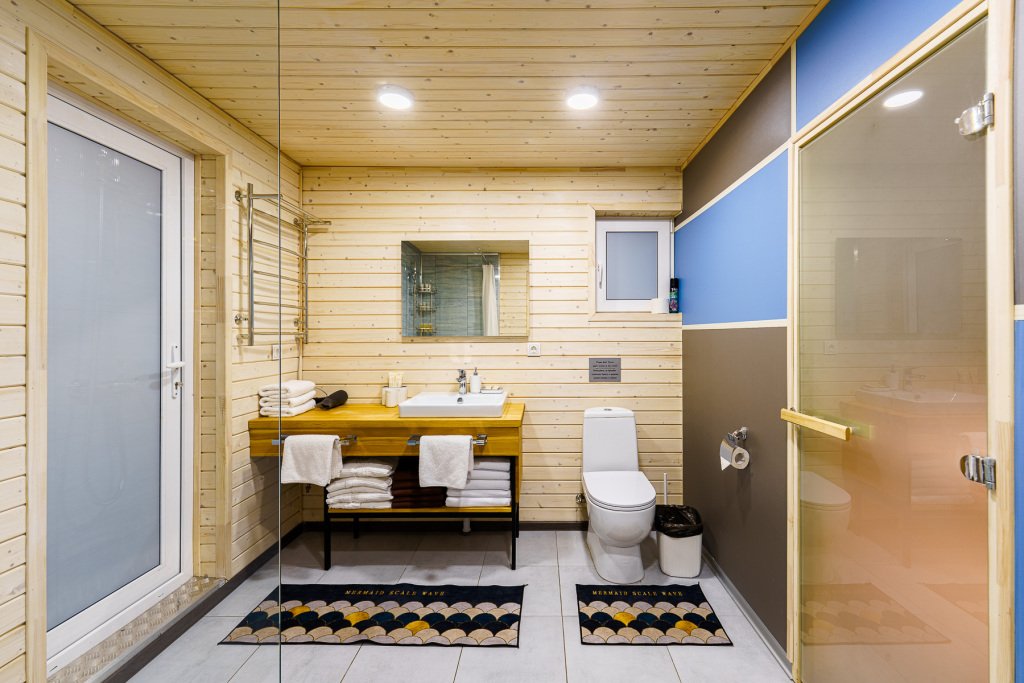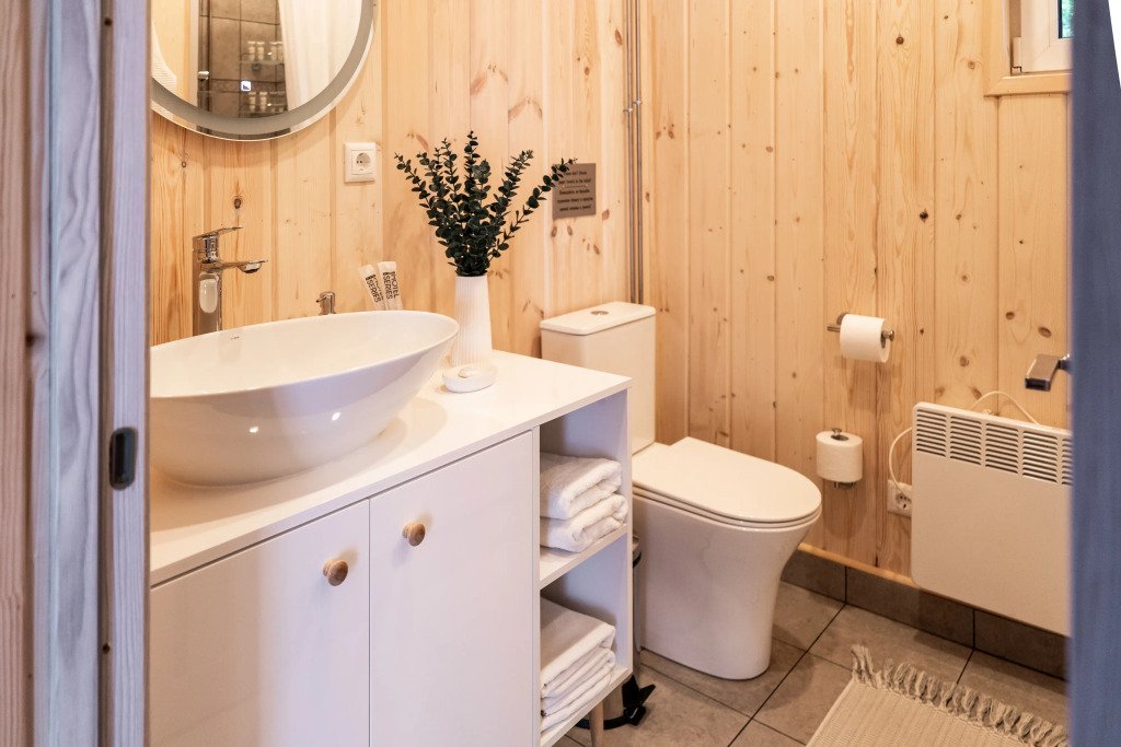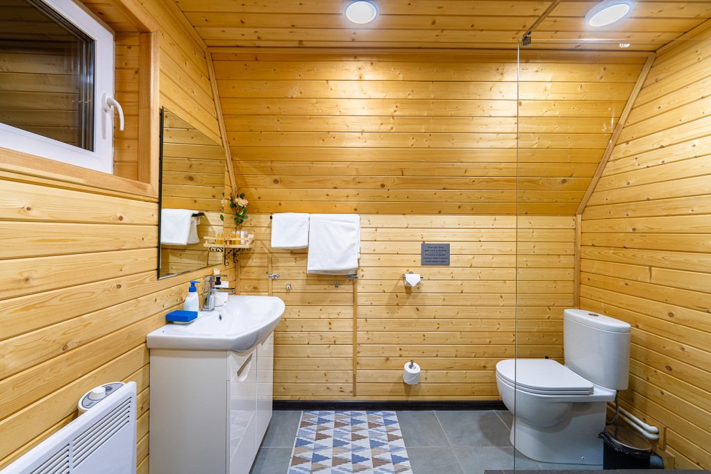 Две спальни, в каждой санузел, душ, косметические принадлежности и комплект полотенец. В каждой комнате и санузле установлены радиаторы. Перед входом — парковка для автомобилей, есть зона для барбекю, дровница, неподалеку отдельно стоящая баня (за дополнительную оплату).