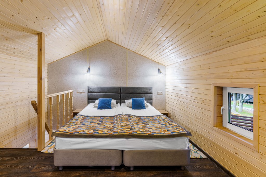 На втором уровне двуспальная кровать или две раздельные с видом на озеро. Рядом с домом — парковка для автомобиля.