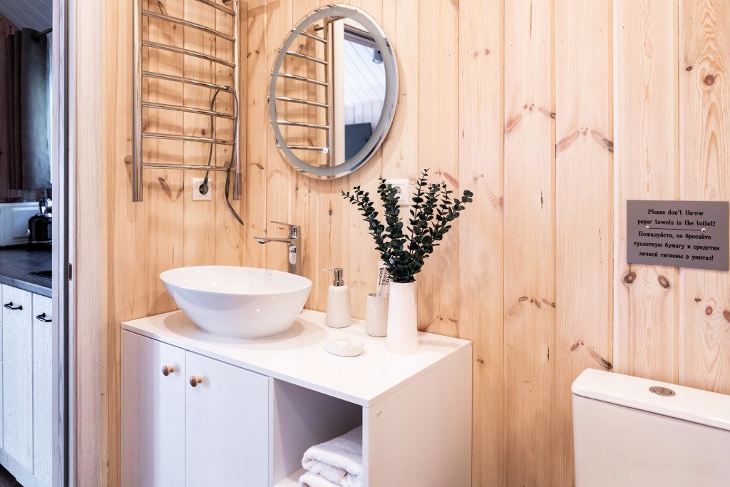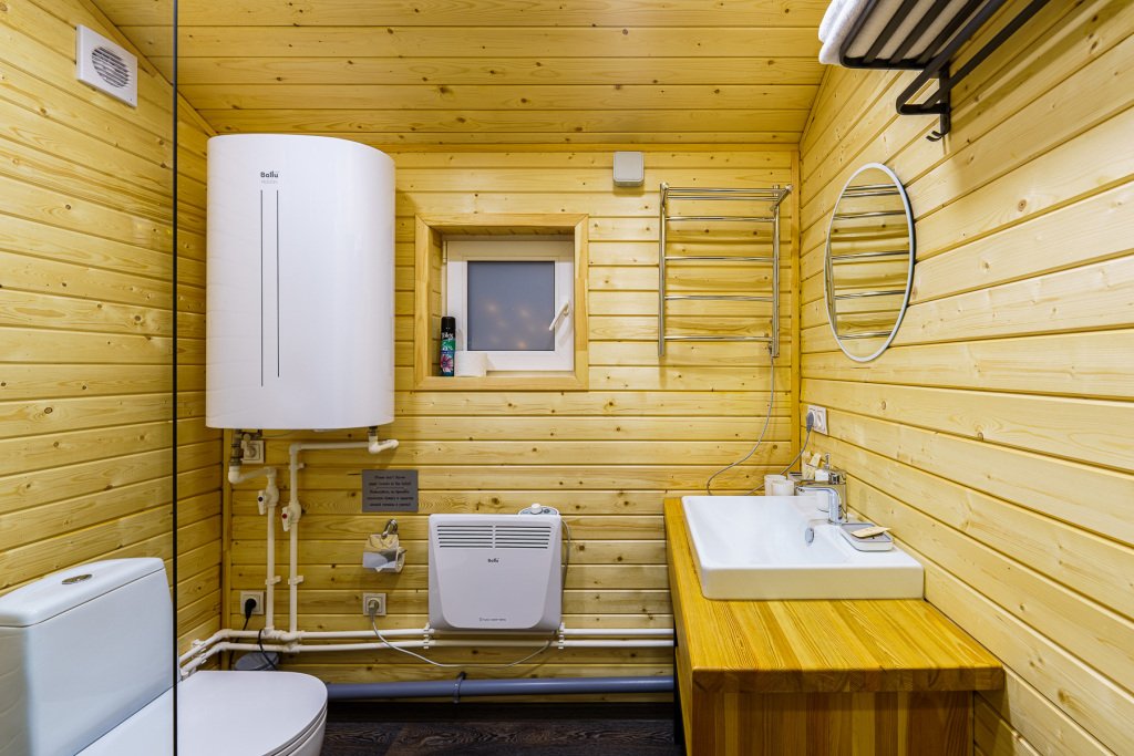 В каждой комнате и санузле установлены радиаторы. Перед входом — парковка для автомобилей, есть зона для барбекю, дровница, неподалеку отдельно стоящая баня (за дополнительную оплату).