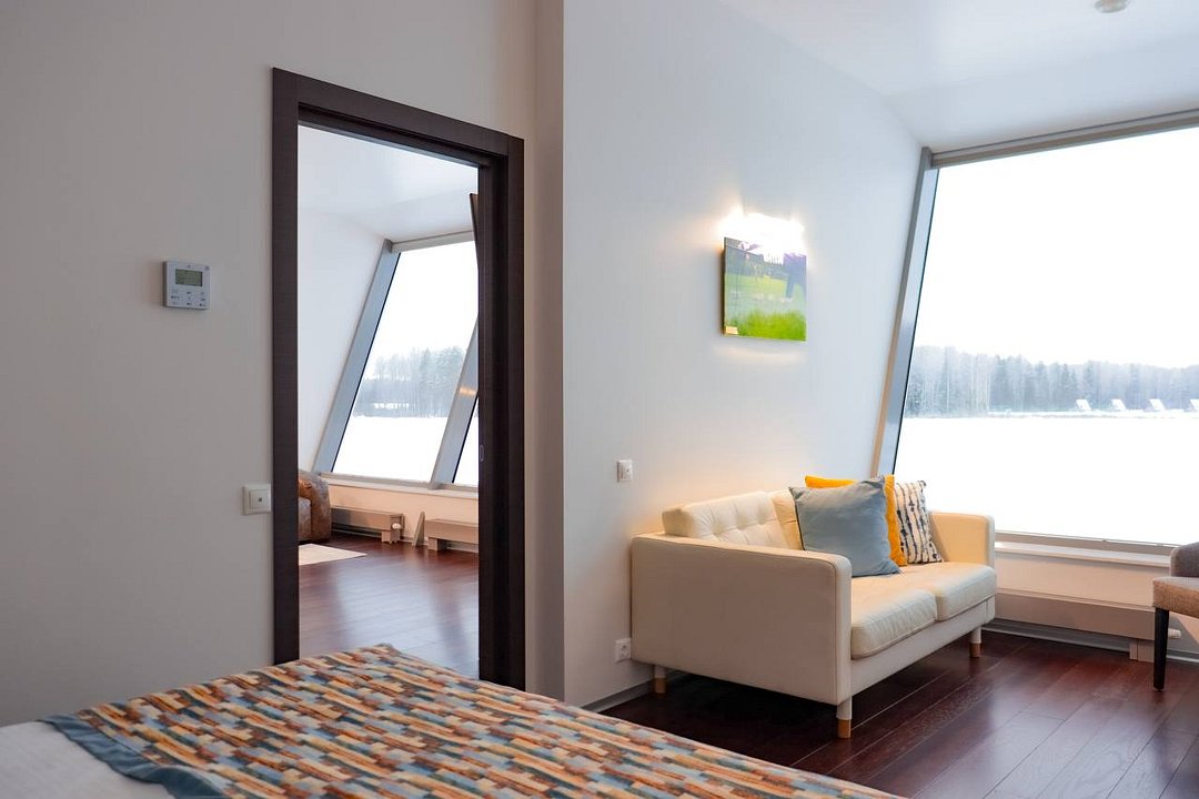 Уютная гостиная с панорамным остеклением, две кровати размером 90х200 см или одна двуспальная кровать 180х200 см с матрасами COMFORT PLUS , телевизором, обеденным столом со стульями, интернетом. Кухонный уголок оснащен электрической плиткой, чайником, набором посуды и приборов. Два выхода – центральный и на патио с видом на воду и доступом к рыбной ловле (платно/услуга предоставляется в летнее время). В ванной комнате: душ, туалет, косметические принадлежности, комплект полотенец, халаты и тапочки.