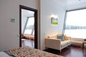 Удобные и уютные двухкомнатные номера категории «Люкс» 38 м². Светлая цветовая гамма, уникальная комплектация, дизайнерская мебель создают особенную атмосферу в номерах. Почему бы не выбрать панорамные окна от пола до потолка, когда декорациями вашего интерьера выступает сама природа?