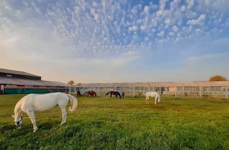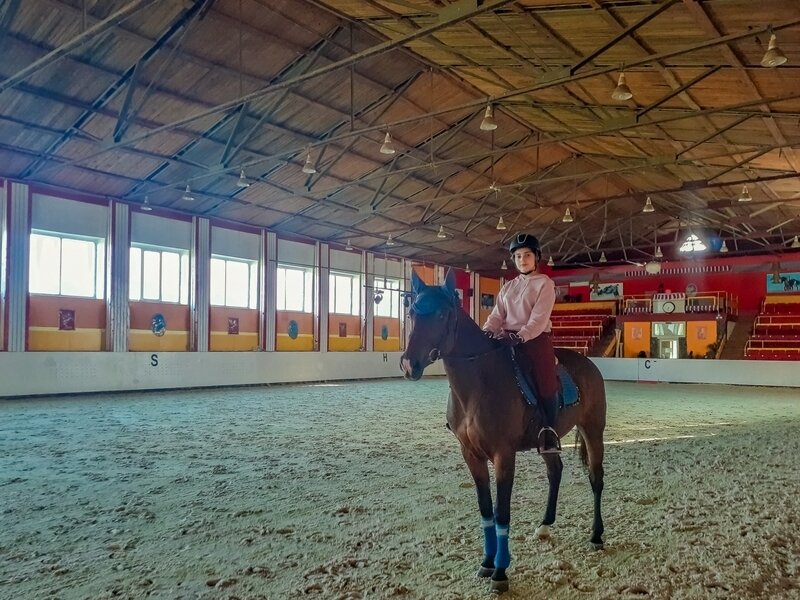 Урок верховой езды на лошади в крытом манеже с инструктором:- 45 минут — 2 500 ₽;